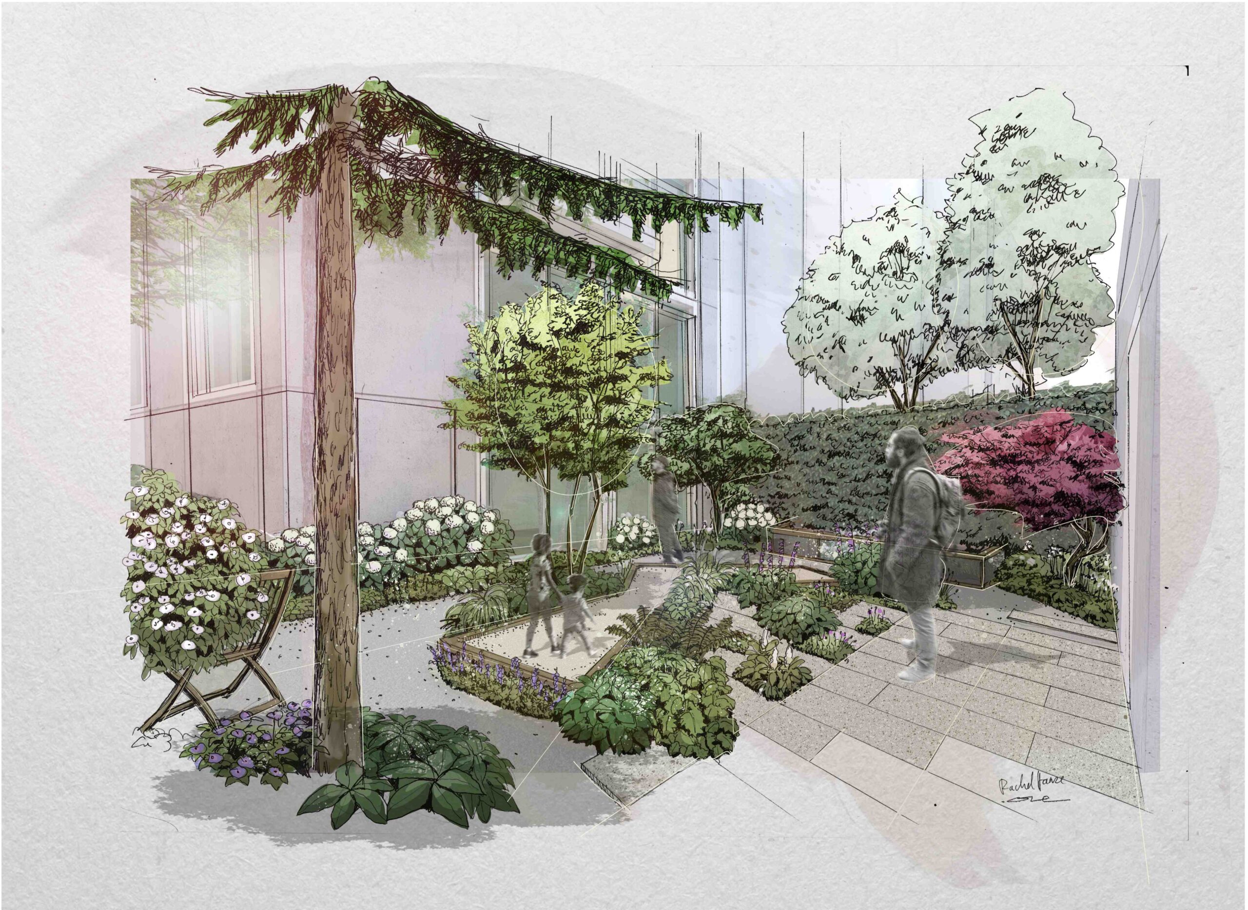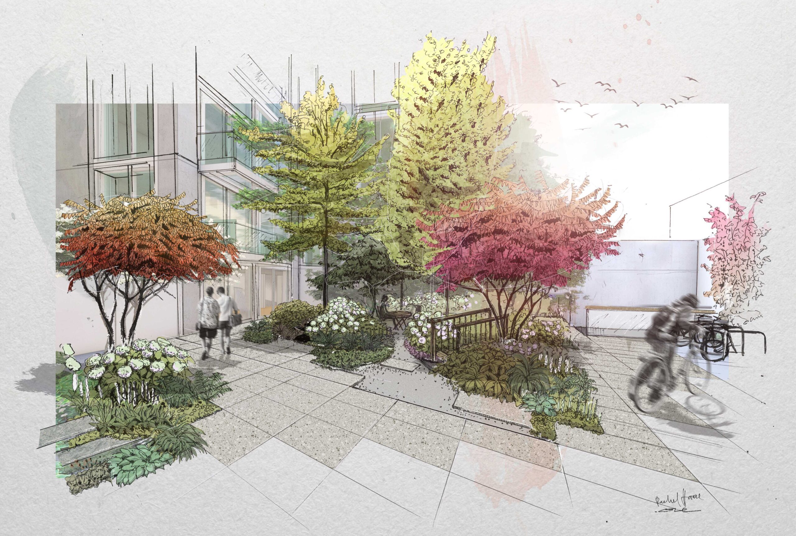 Der Innenhofgarten ist in einem zeitgenössischen, modernen Stil gestaltet, der die klare Formensprache des geplanten Bürogebäudes aufgreift und zugleich einen atmosphärischen Kontrast zur urbanen Umgebung schafft. Er dient als Rückzugsort und als Pufferzone zwischen dem Gebäude und dem lebhaften Straßenraum des Bezirks.