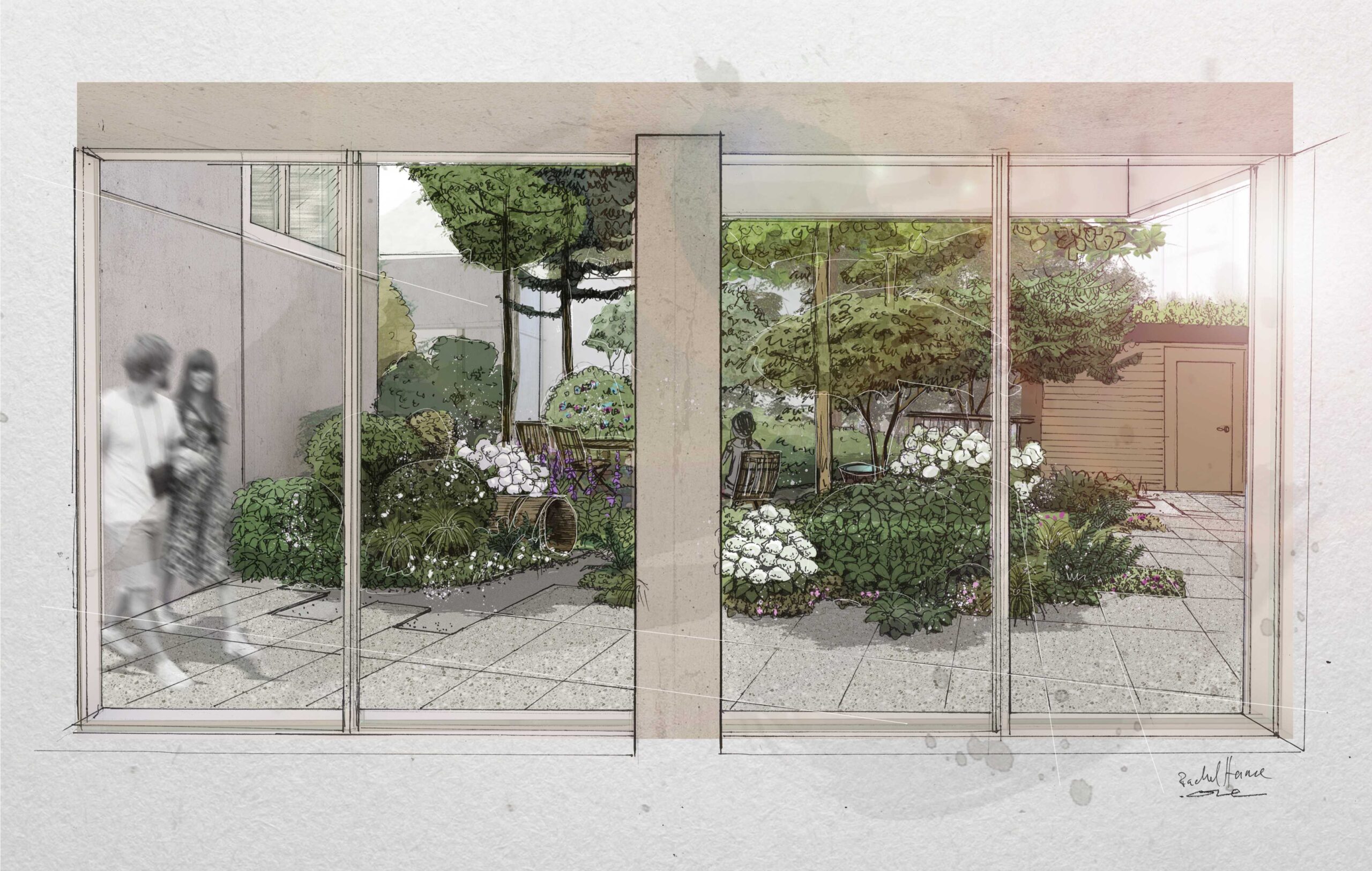 Dem Wunsch des Bauherrn folgend entsteht ein verwunschener „Hexengarten“ – ein üppig bepflanzter, lebendiger Ort mit Fassadenbegrünung, versteckten Nischen und einer geheimnisvollen Gartenstimmung. Pflanzen mit unterschiedlichen Wuchsformen und Blatttexturen setzen einen weichen, organischen Kontrapunkt zur Strenge der Architektur. Sämtliche geeigneten vertikalen Flächen werden begrünt, um ein Gefühl von Ruhe und Geborgenheit in diesem grünen Refugium zu erzeugen.