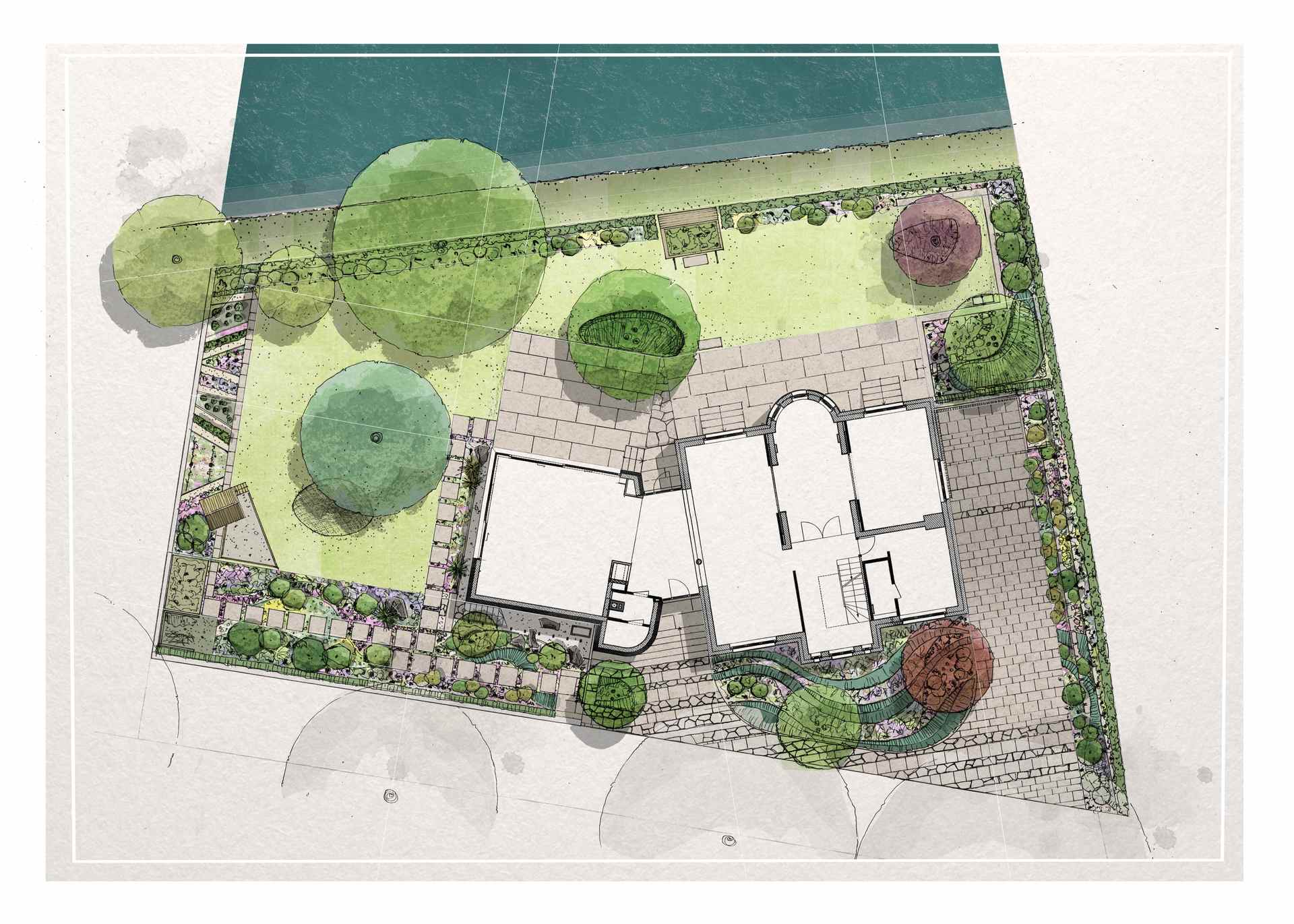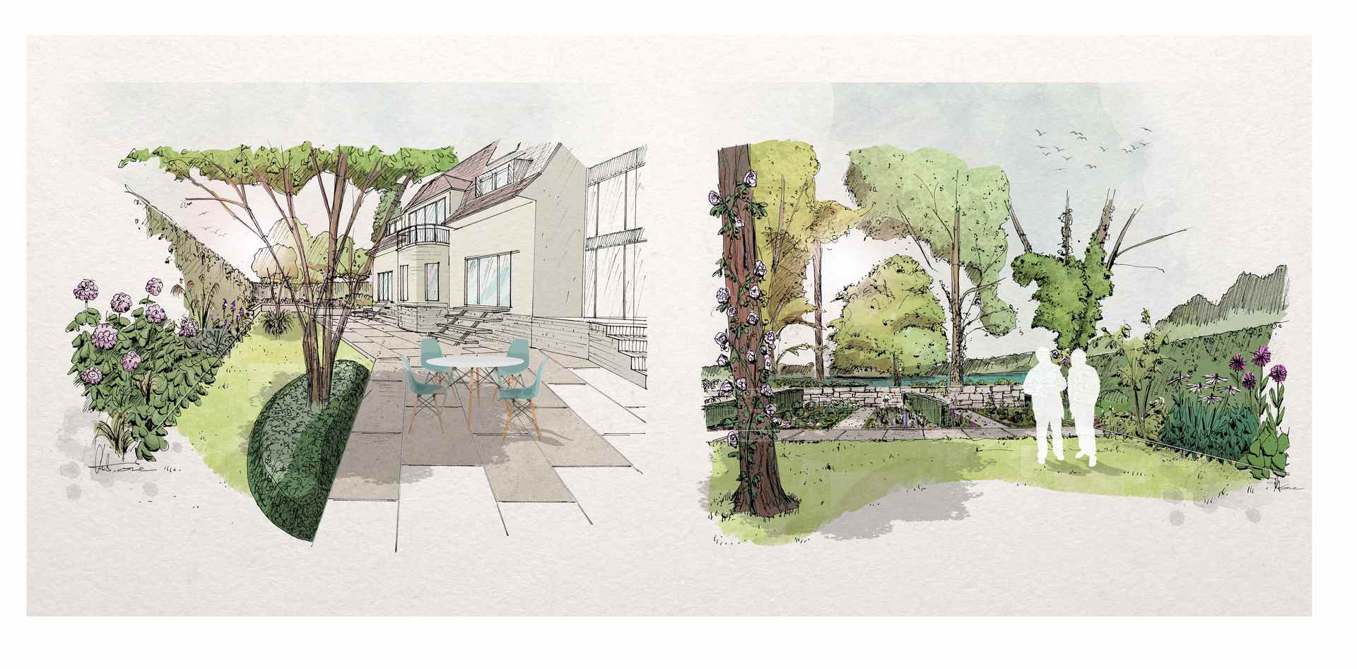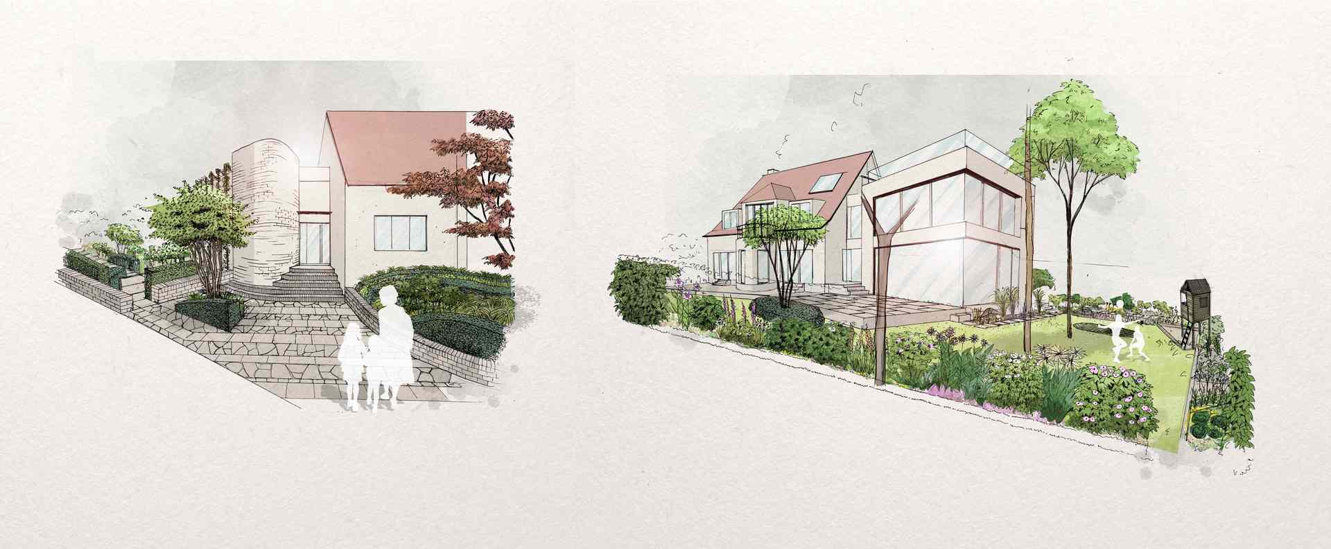 Mit den Erweiterungsbauten am Wohnhaus sollte auch der Garten neu angelegt werden. Der Wunsch des Bauherrn war ein familienfreundlicher, offener und zugleich romantischer Garten. Der Vorgarten, die Zuwegung zum Wohnhaus, die umlaufenden Vegetationsflächen sowie der Rampenbereich sollten neugestaltet werden. Im Hangbereich wurde die Errichtung einer Müllstandanlage vorgesehen, inklusive einer passenden Einhausung und Türgestaltung. Zudem wurde eine Toranlage für den neuen Fahrradkeller geplant.