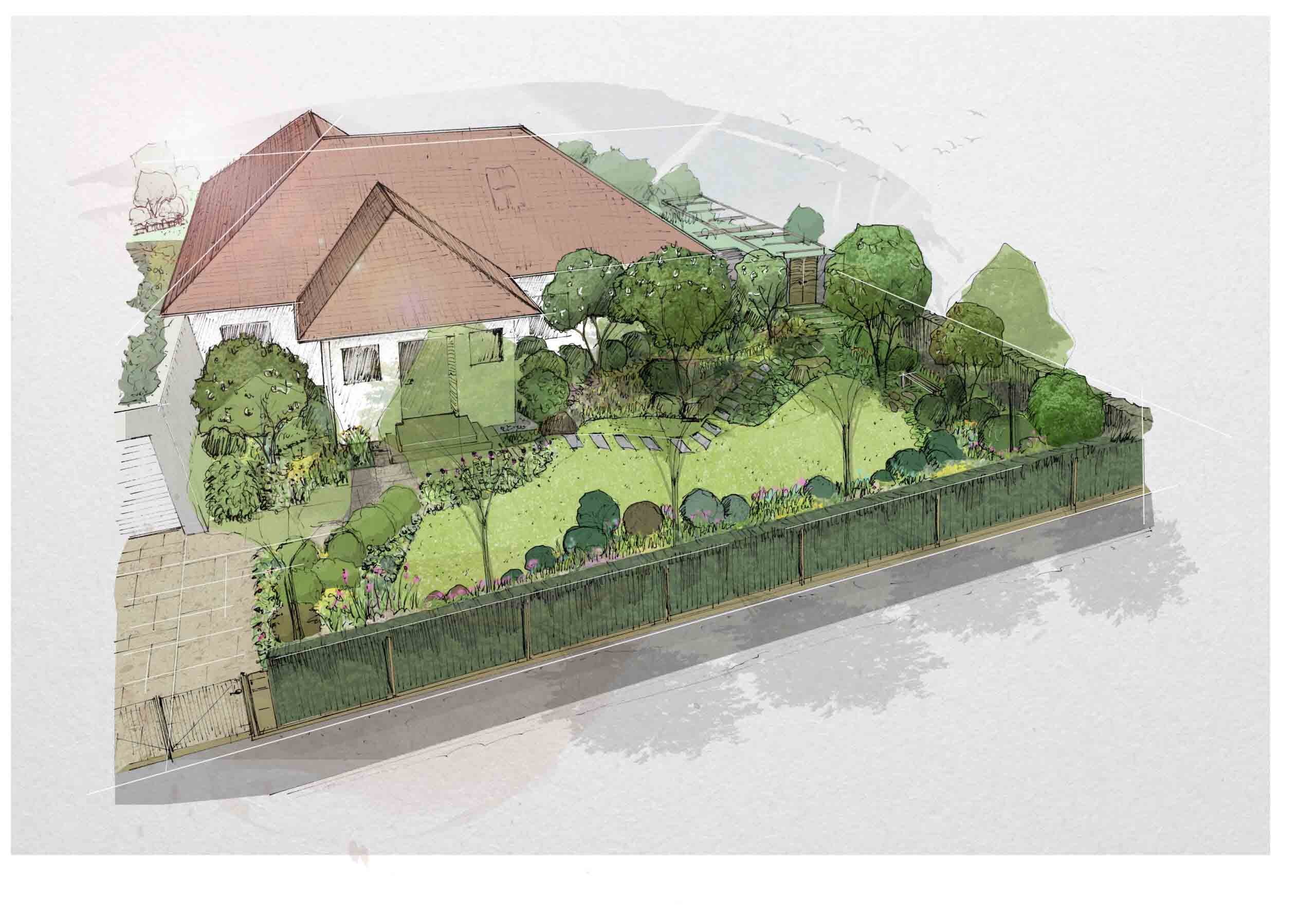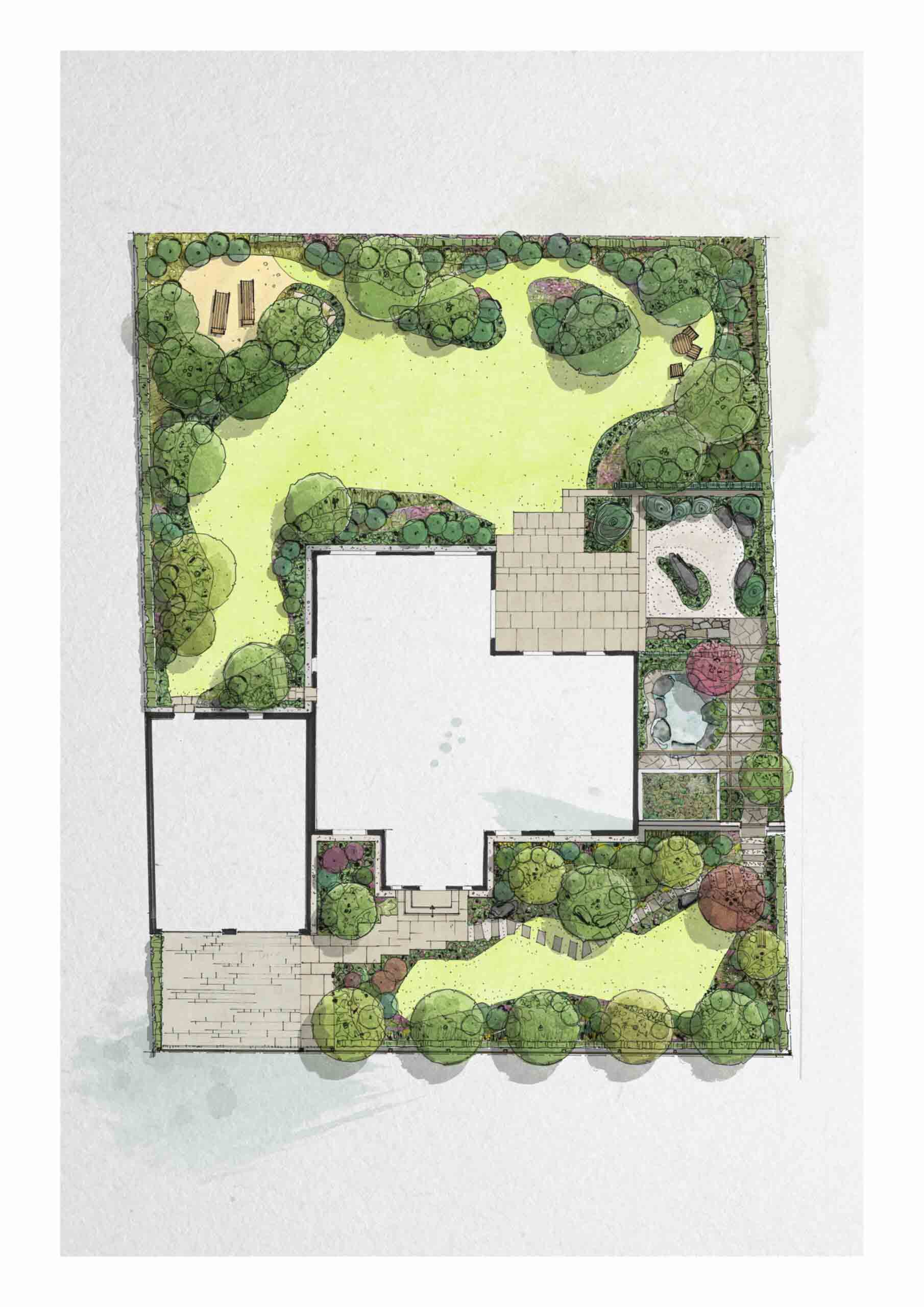 Ergänzend sorgt eine sorgfältig geplante Sichtschutzpflanzung für Privatsphäre und rahmt die einzelnen Gartenräume. So entsteht ein abwechslungsreicher Garten, der Ruhe, Erlebnis und Funktionalität in einer klaren, zeitlosen Gestaltung vereint.