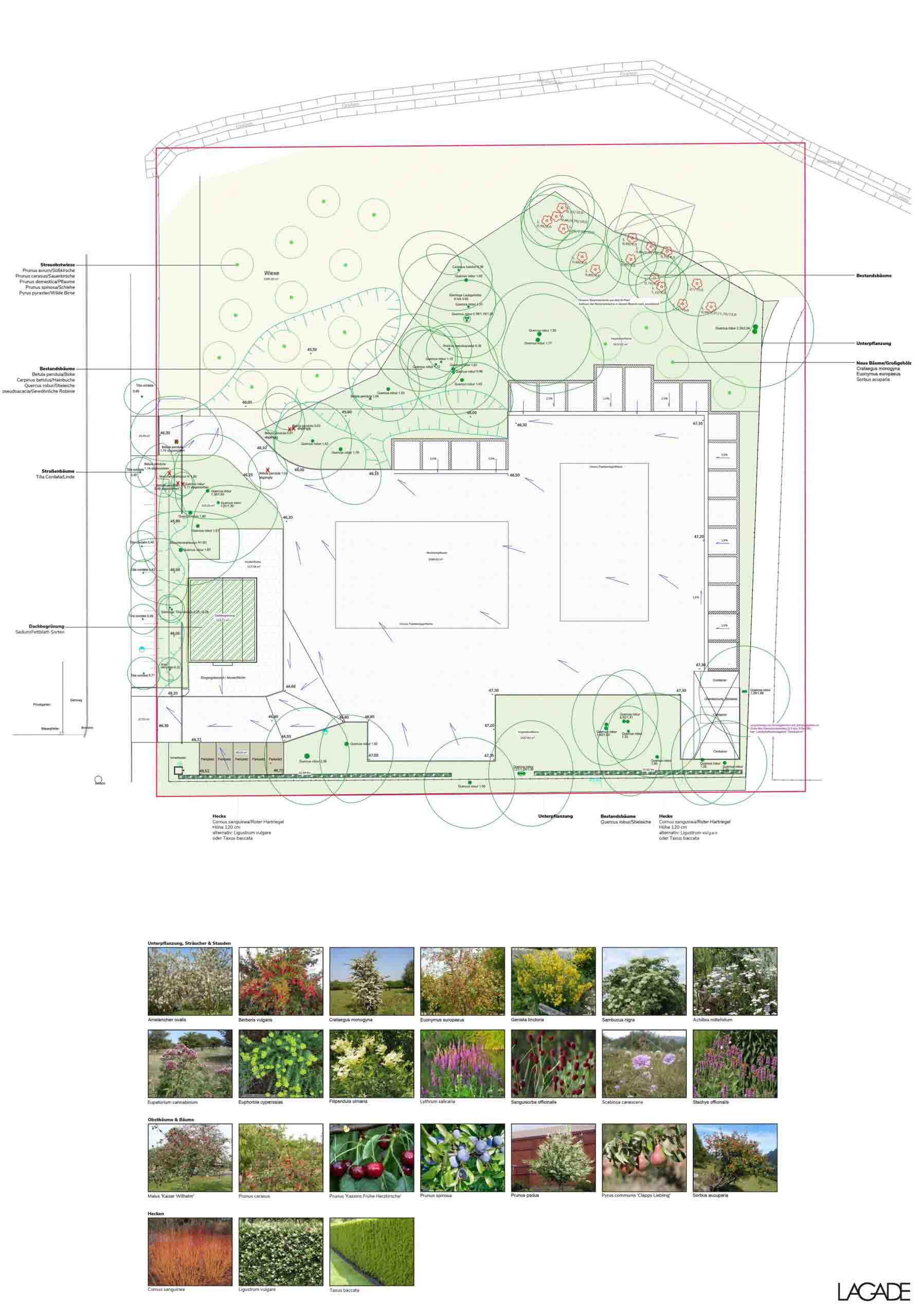 Im Rahmen der Planung wurde ein detailliertes Pflanzkonzept erarbeitet, das sowohl Eingriffs- als auch Ausgleichsmaßnahmen berücksichtigt. Ziel ist es, die gewerbliche Nutzung mit ökologischen und gestalterischen Aspekten zu verbinden und einen funktionalen, zugleich ansprechenden Außenraum zu schaffen, der Arbeitsprozesse unterstützt und das Grundstück nachhaltig strukturiert.