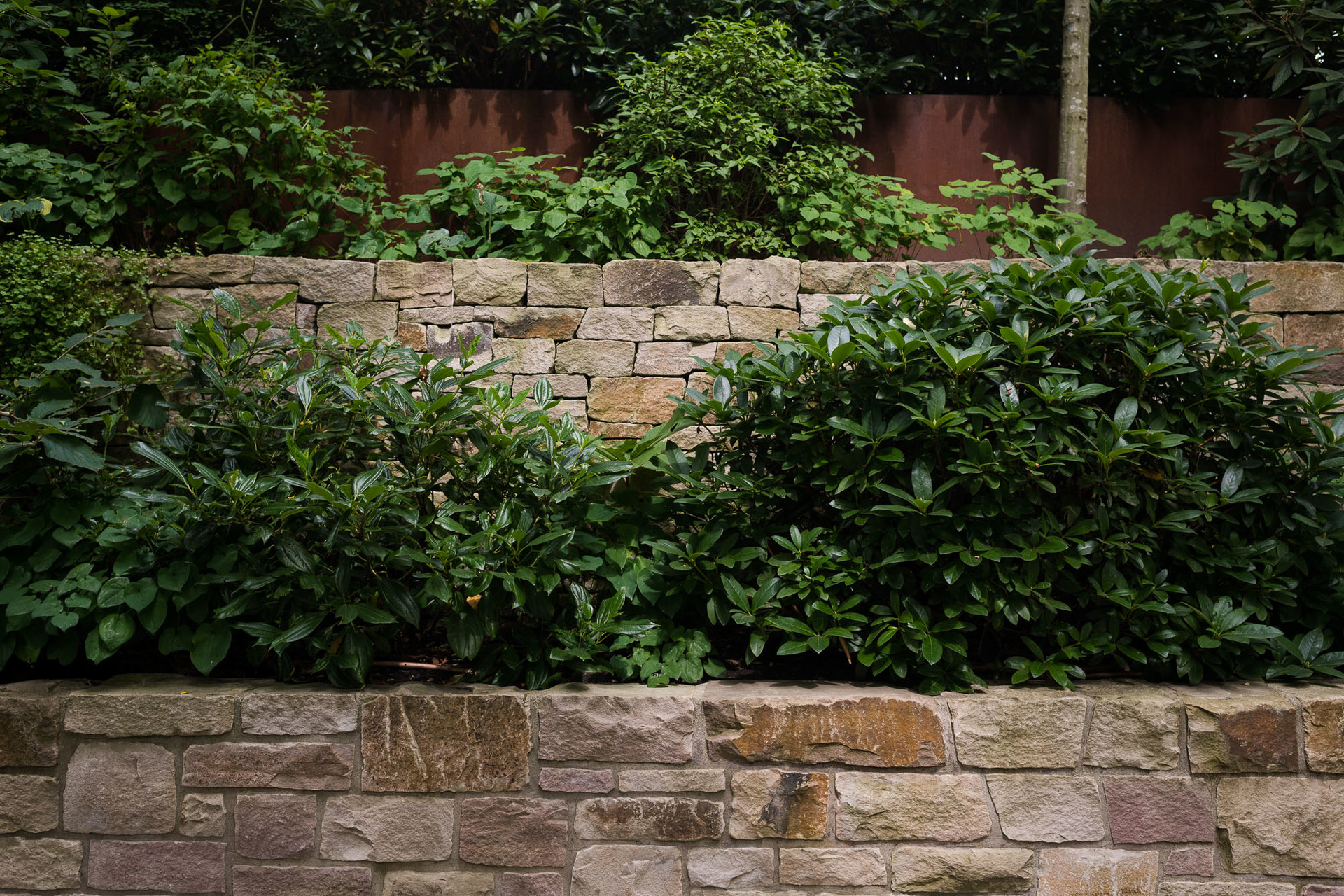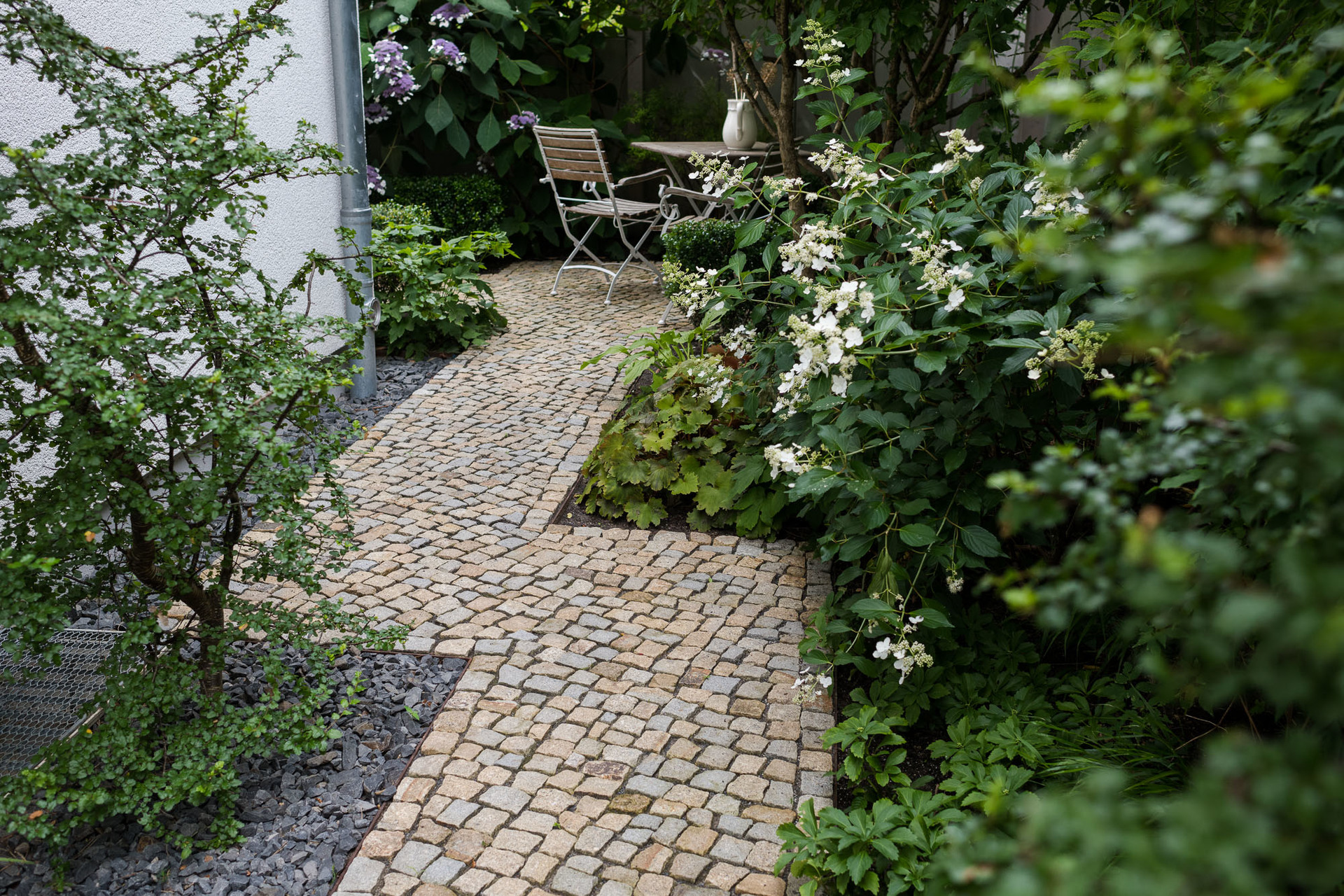 Eine elegante Treppenanlage aus herbstlich gefärbtem Granit und eine charakterstarke Trockenmauer aus Kalkstein strukturieren den Garten und schaffen harmonische Übergänge zwischen den Ebenen. Geschwungene Wege aus Mosaik-Granitpflaster führen vorbei an üppigen Stauden, Gräsern und schirmförmigen Ziergehölzen zu großzügigen Natursteinpodesten und intimen Rückzugsorten.