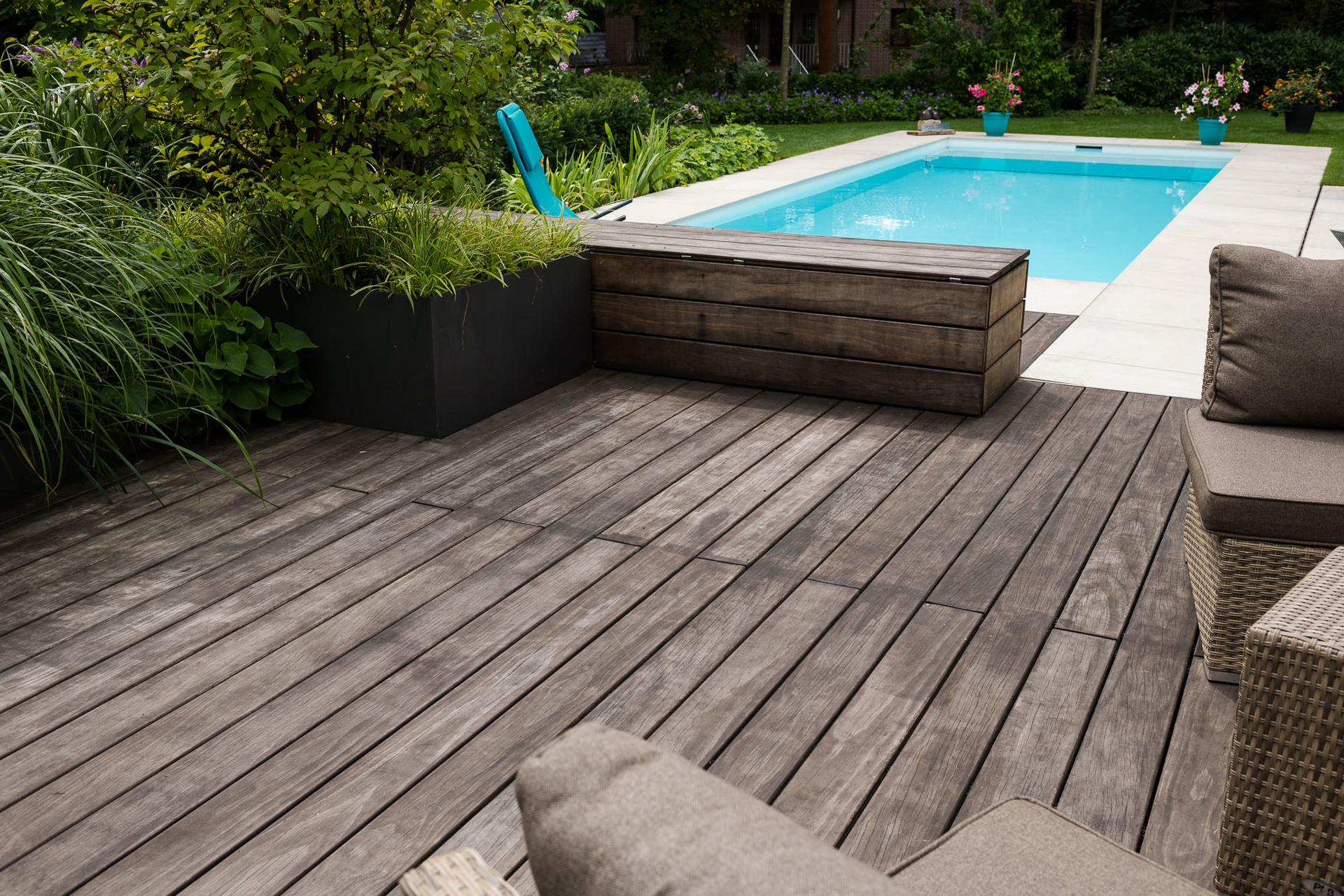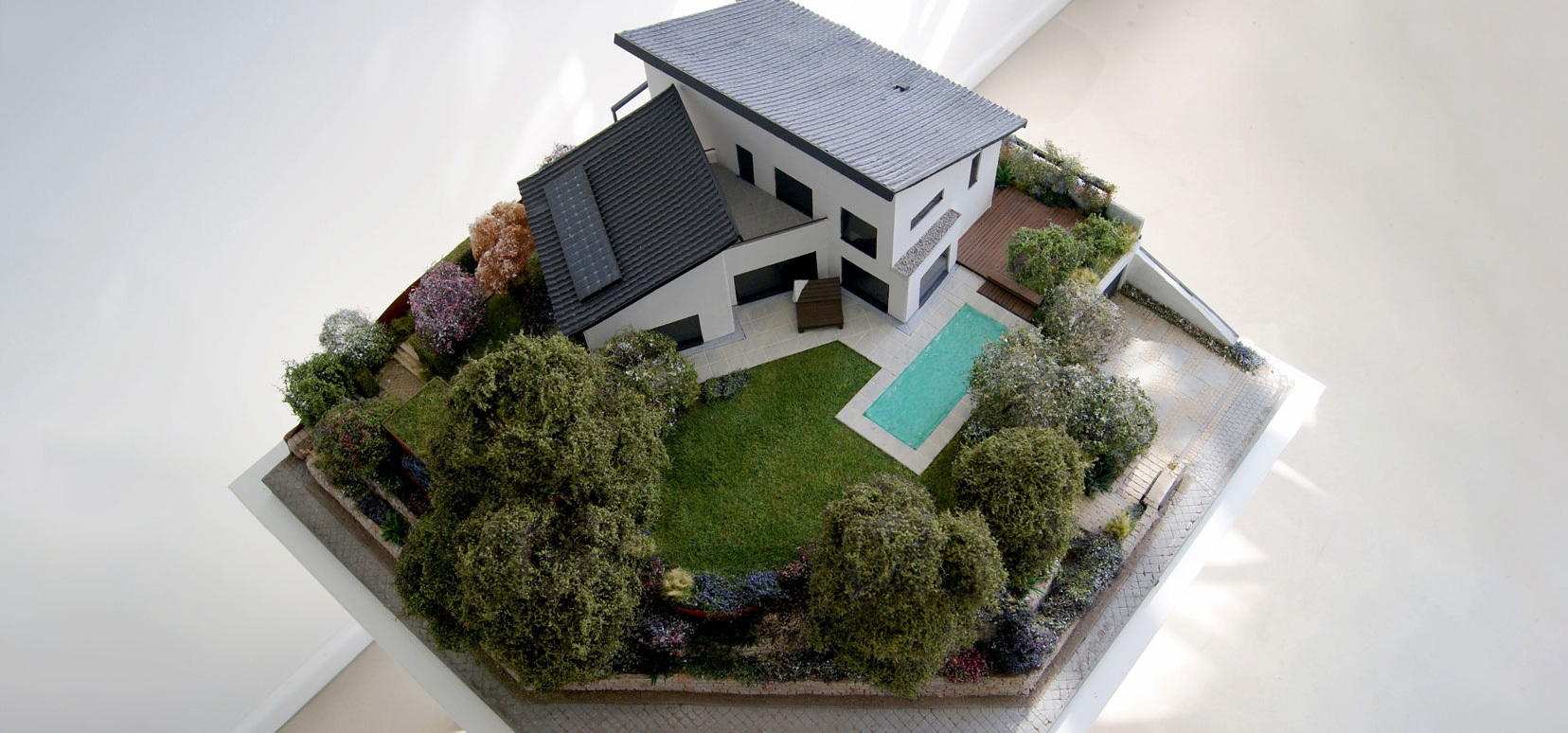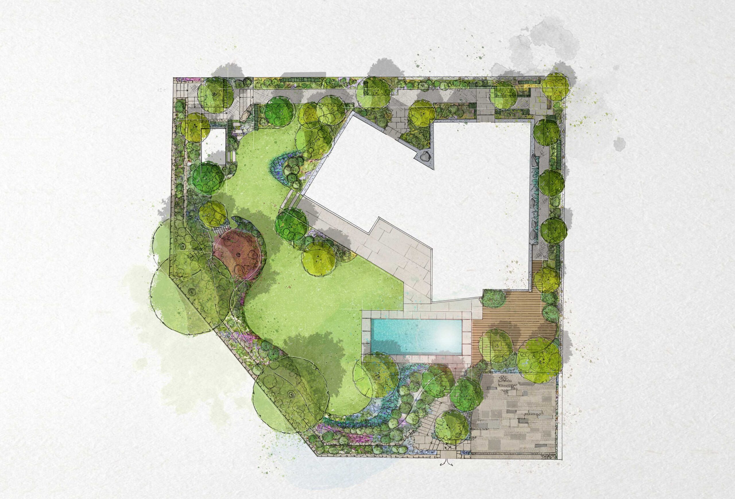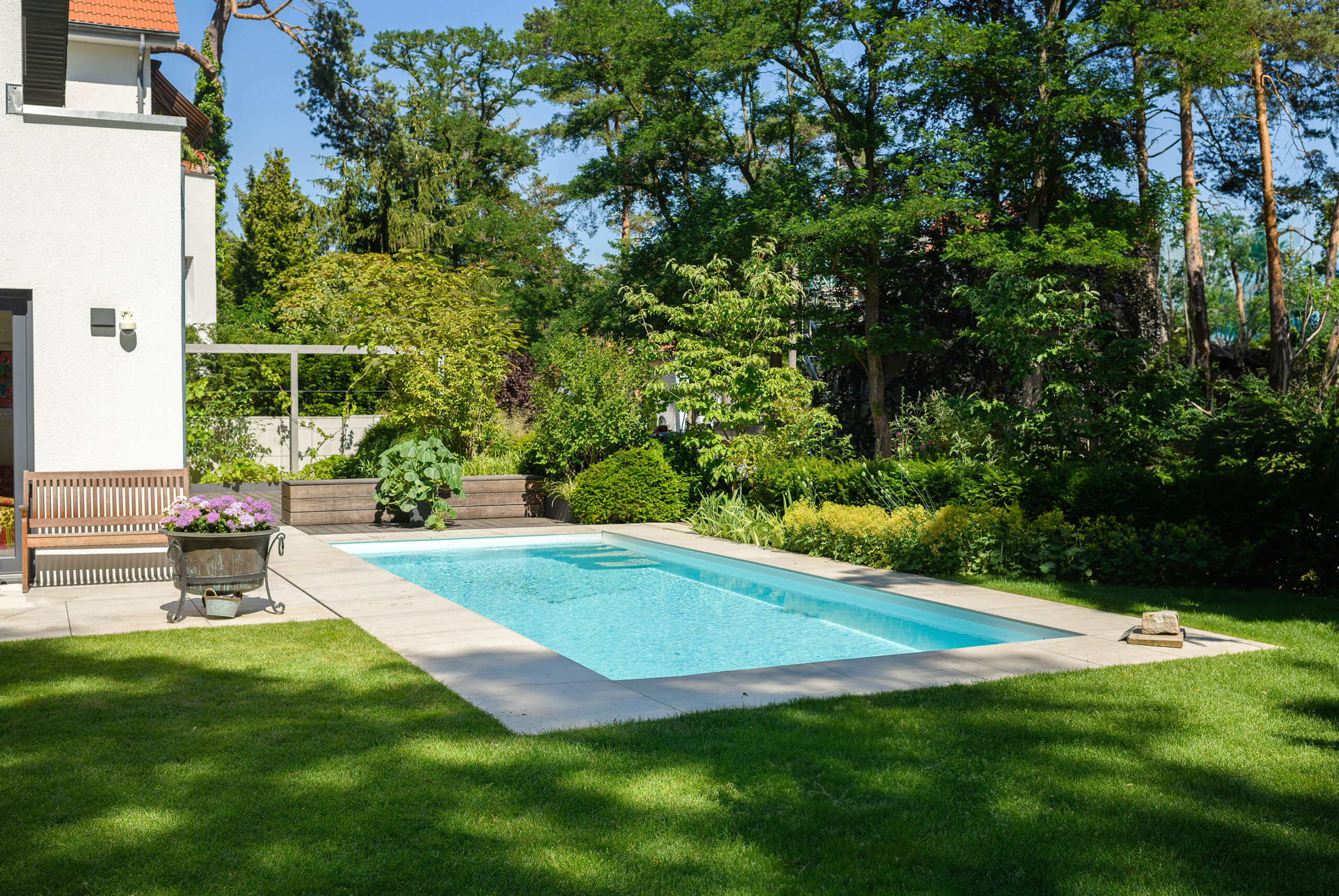 Rasenparterres, ganzjährig attraktive Pflanzbeete und Moosinseln verleihen dem Garten Tiefe und Ruhe. Die Terrasse aus großformatigen Muschelkalkplatten verbindet Haus und Garten, ergänzt durch einen stilvollen Swimmingpool, eine Holzterrasse unter Trompetenbaum-Blätterdach und eine berankte Pergola als natürlicher Sichtschutz.