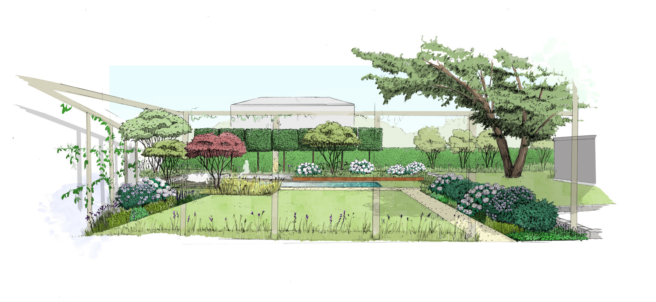Ein zentraler Bestandteil der Planung ist die Integration eines Pools im bislang ungestalteten rückwärtigen Gartenbereich. Der Poolbereich wird als eigenständiger, ruhiger Rückzugsort konzipiert, der sich vor Einblicken aus der Nachbarschaft schützt, ohne den Garten vollständig abzuschirmen oder einzuengen. Durch gezielt gesetzte Pflanzungen und gestalterische Elemente entsteht ein ausgewogenes Verhältnis von Offenheit und Privatsphäre. Optional kann in diesem Bereich ein Poolhaus ergänzt werden, das funktionale Anforderungen mit architektonischer Zurückhaltung verbindet.