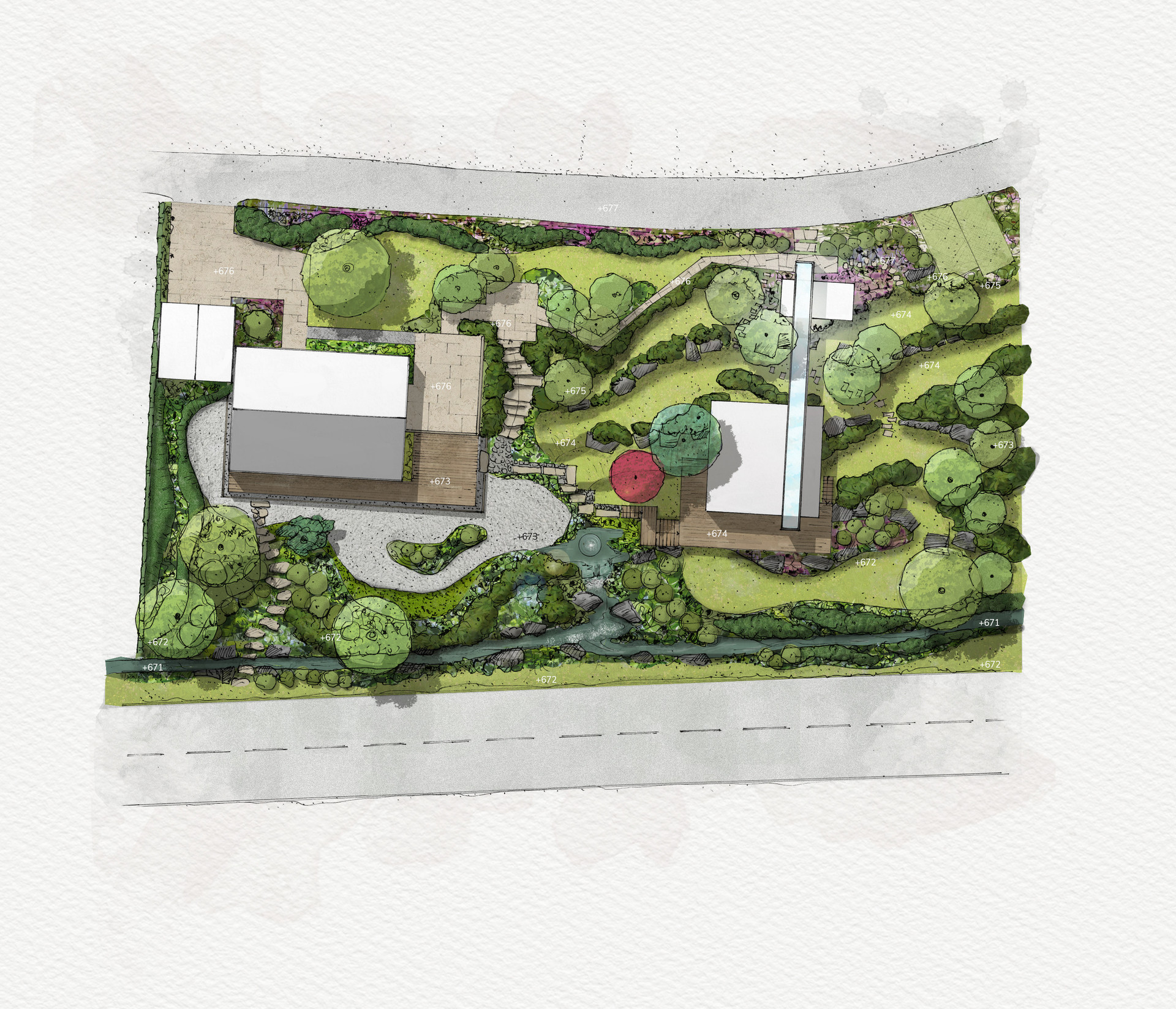 Das Grundstück wird von der höher gelegenen Nordseite über eine Zufahrtsstraße erschlossen. In diesem Bereich orientiert sich das Landschaftsbild an der regionalen Gartenkultur. Eine großzügig gestaltete Hoffläche führt zum Haupteingang des Almhauses, von dem aus ein geschwungener Kiesweg in den Gartenbereich überleitet – bis hin zu einer weitläufigen Terrasse, die einen beeindruckenden Blick über das Tal eröffnet.