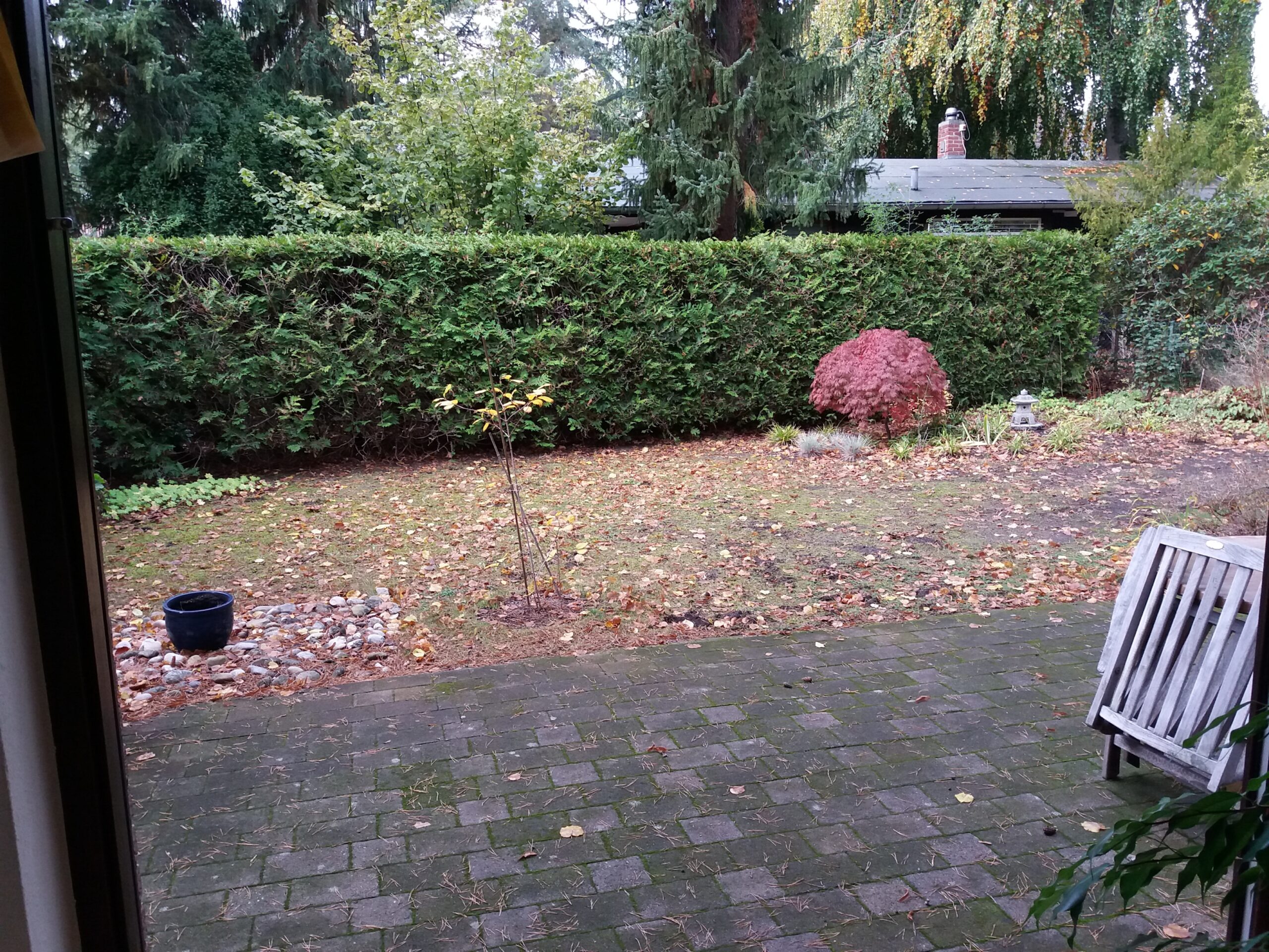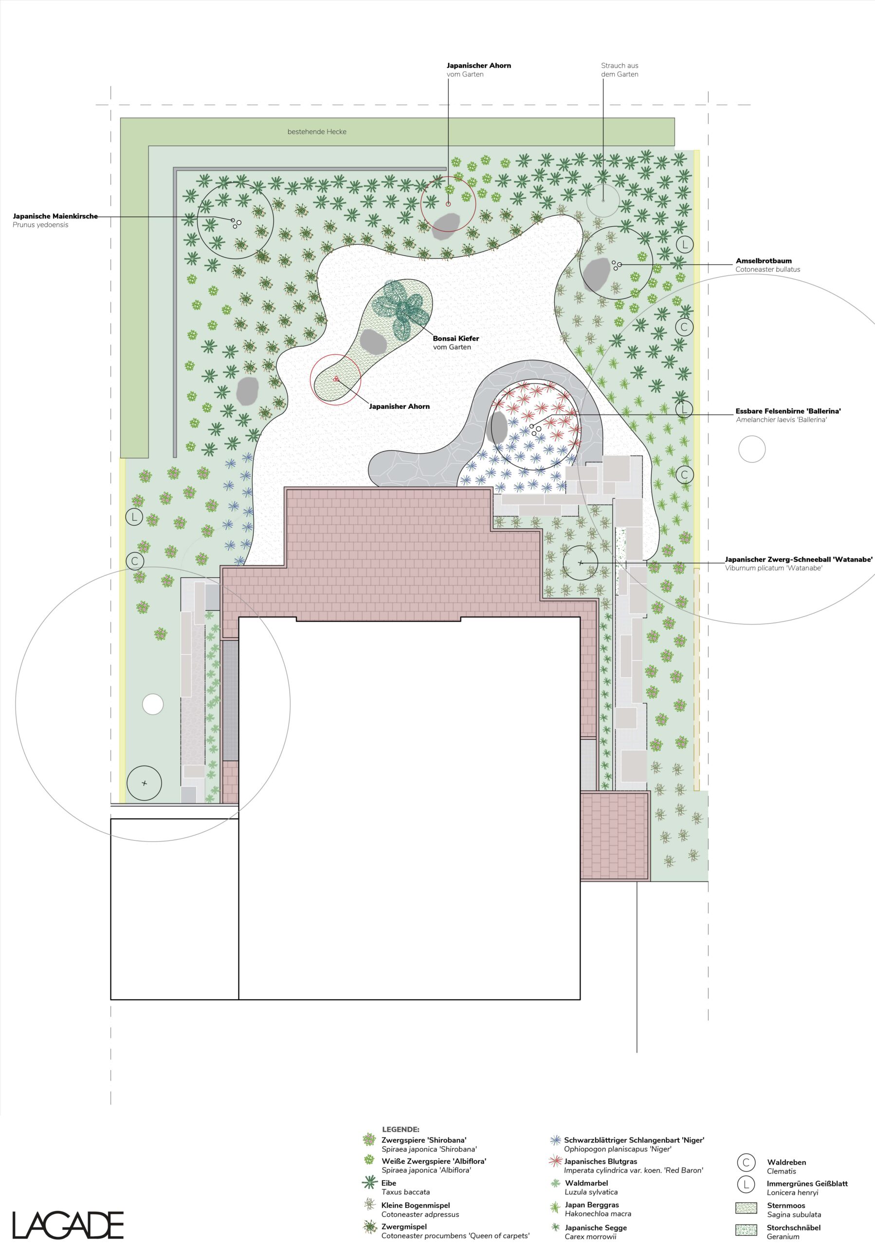 Der Vorgarten bleibt bewusst in seiner bestehenden Gestaltung erhalten. Nach außen gibt es keinen offensichtlichen Hinweis auf den besonderen Garten im rückwärtigen Bereich. Lediglich eine dezent platzierte japanische Steinlaterne im Vorgarten fungiert als stilles Zeichen und feiner Verweis auf die dahinterliegende Gartenwelt.