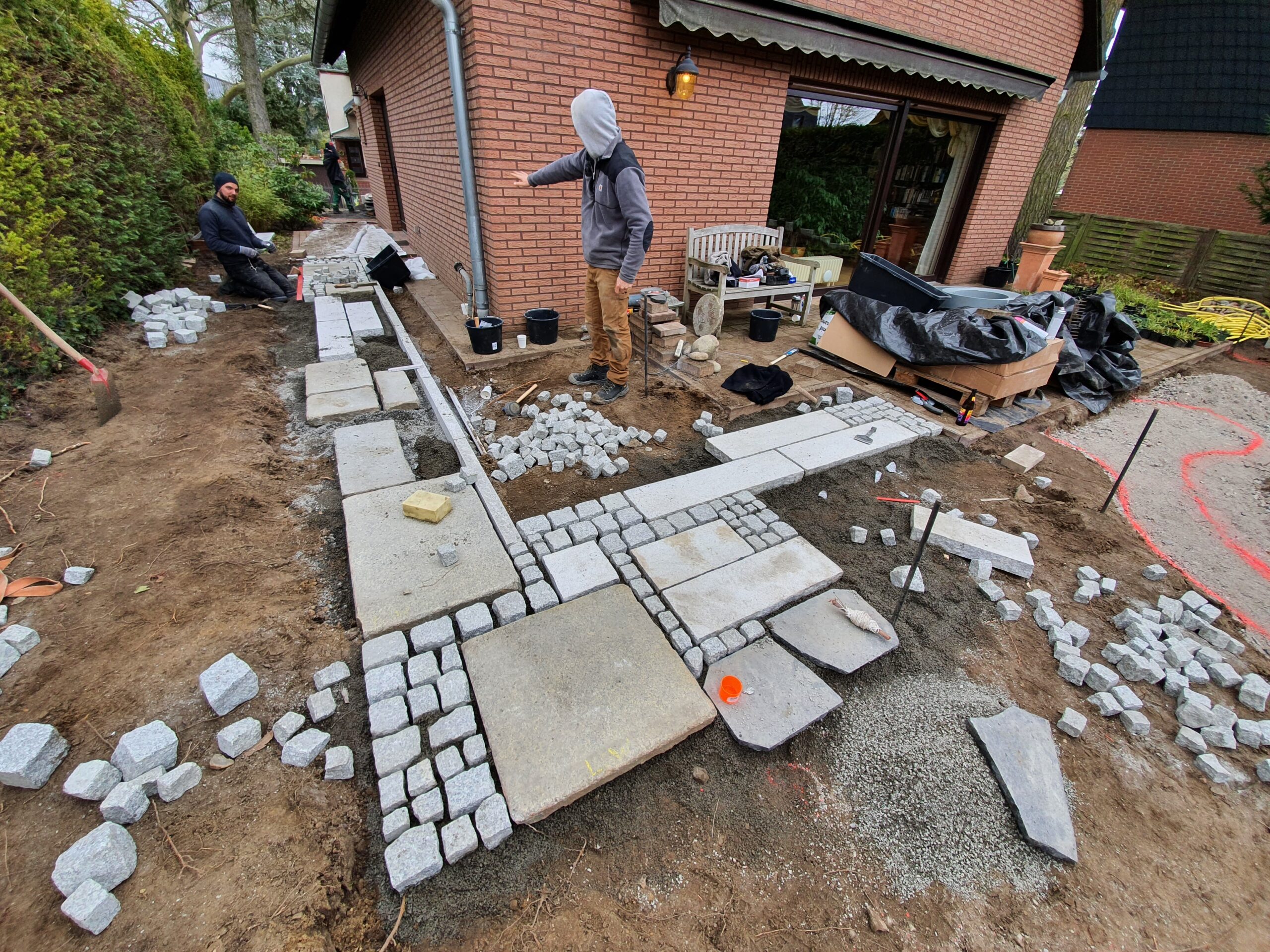 Die befestigten Bewegungsflächen abseits des Wohnhauses werden ausschließlich aus Naturstein hergestellt. Die Wegeführung orientiert sich an der traditionellen japanischen Wegebaukunst: einzeln gesetzte Trittsteine und Stelen strukturieren die Bewegung durch den Garten, während die Zwischenräume mit Pflastersteinen mit handbearbeiteten Kanten ausgeführt werden. So entsteht ein bewusst unregelmäßiges, ruhiges Wegegefüge, das zur langsamen Fortbewegung einlädt.
