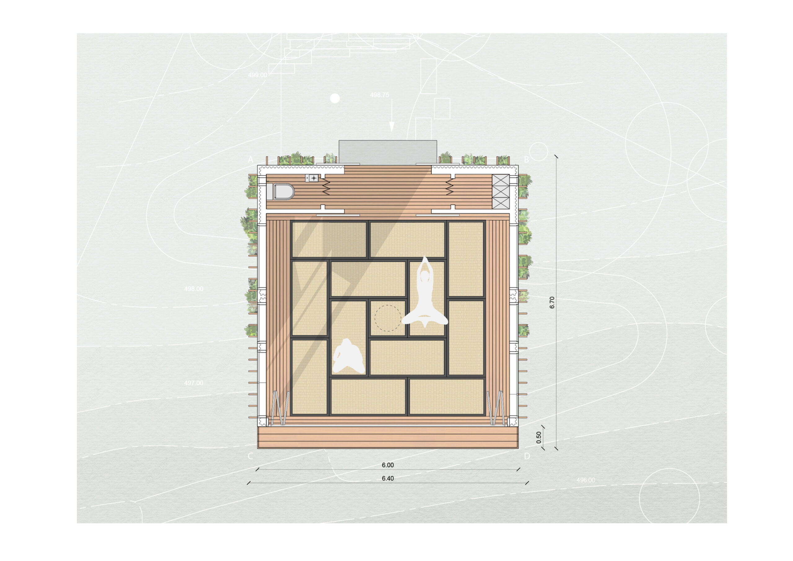 Die hochwertigen Innenmaterialien – darunter Kirschholz, Hanf und weiches Reisstroh – schaffen ein ökologisch gesundes und ästhetisch ansprechendes Ambiente. Japanische Tatami-Matten in traditionellem Muster erinnern an die Tee- und Zazenkultur und bieten höchsten Sitzkomfort für die Meditation.