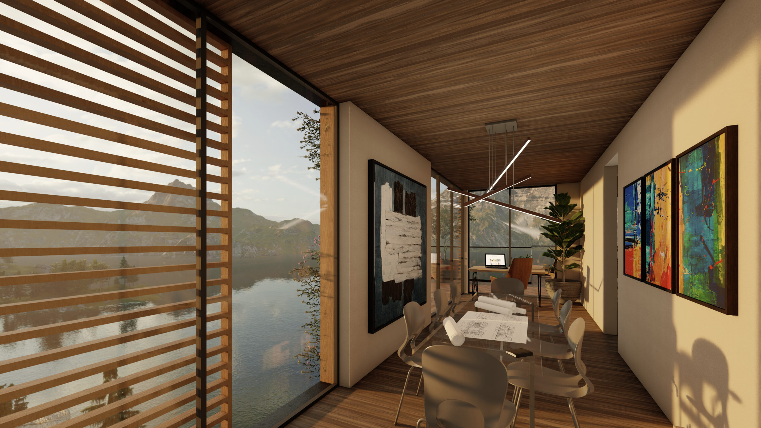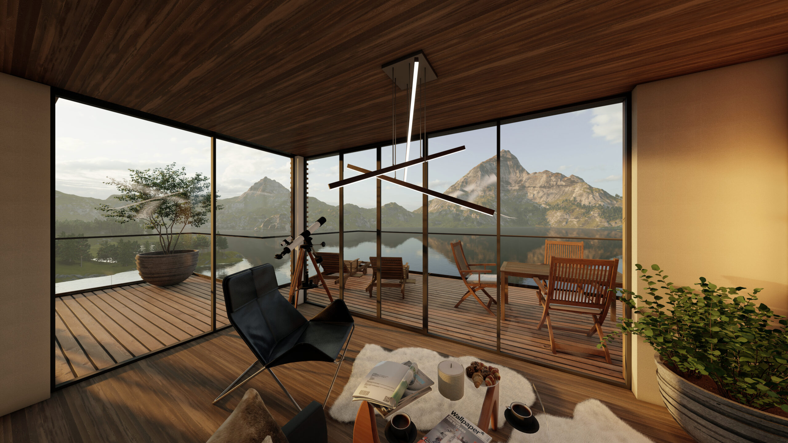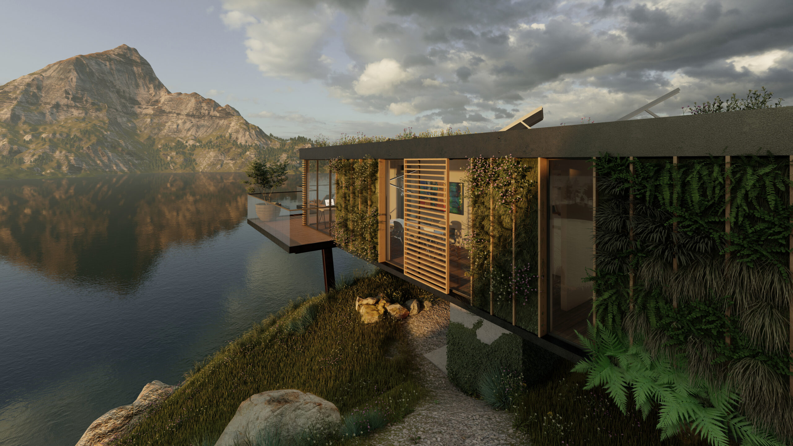Die Modulbauweise ermöglicht einen einfachen Transport und einen schnellen Aufbau. Aufgeteilt in zwei Einheiten – einem Wohn- und einem gesonderten Arbeitsbereich – dient das kleine attraktive Gebäude zum einen als Arbeitsplatz mit exzellenter technischer Ausstattung und zum anderen als komfortable und hochwertige Unterkunft in der Natur.