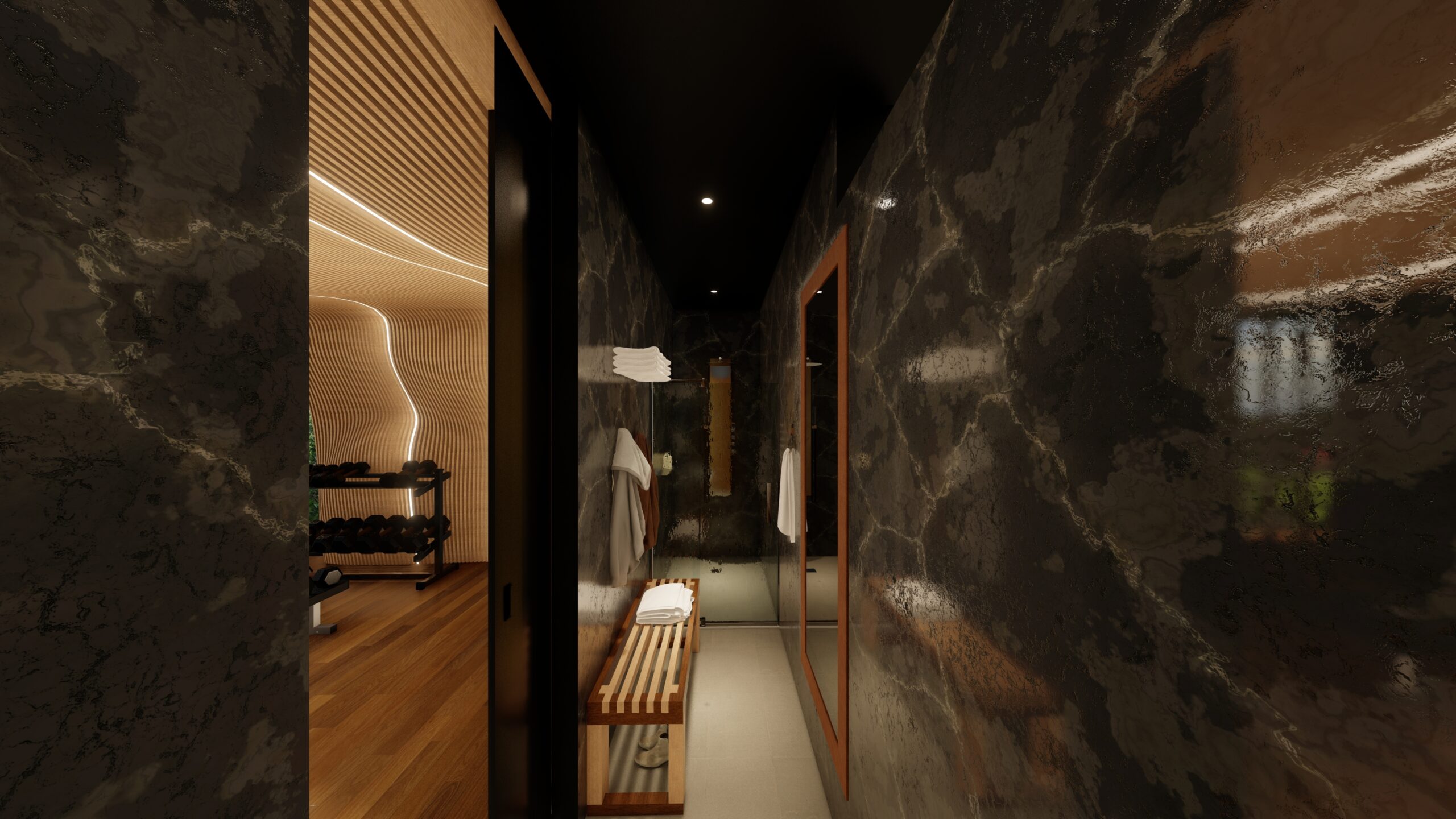 Im Inneren werden natürliche Materialien verwendet, die dank ihrer harmonischen Farbtöne und Texturen ein Gefühl von Einheit mit der Natur vermitteln. Ein kleiner Spabereich bietet eine begehbare Duschkabine sowie WC und Spülbecken in hoher Qualität. Wandpanele aus Naturstein