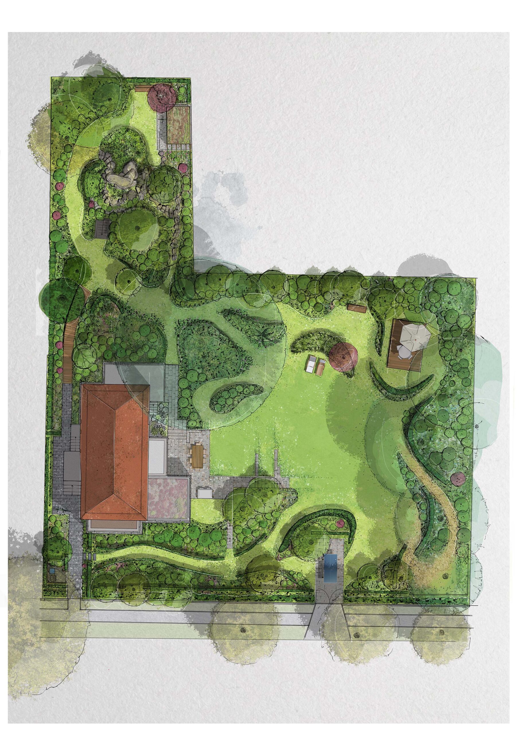 Entstehen soll ein naturnaher Garten, der aufgrund seiner Großzügigkeit Anleihen aus der englischen Gartengestaltung aufnimmt. Weiche Linienführungen und sanfte Schwünge prägen die Wege und Rasenflächen. Begleitet werden sie von einer sorgfältig abgestimmten, standortgerechten Bepflanzung in fließenden Drifts sowie gezielt gesetzten Leitgehölzen. So entwickelt sich ein ruhiges, zugleich kraftvolles Gartenbild mit natürlicher Eleganz.