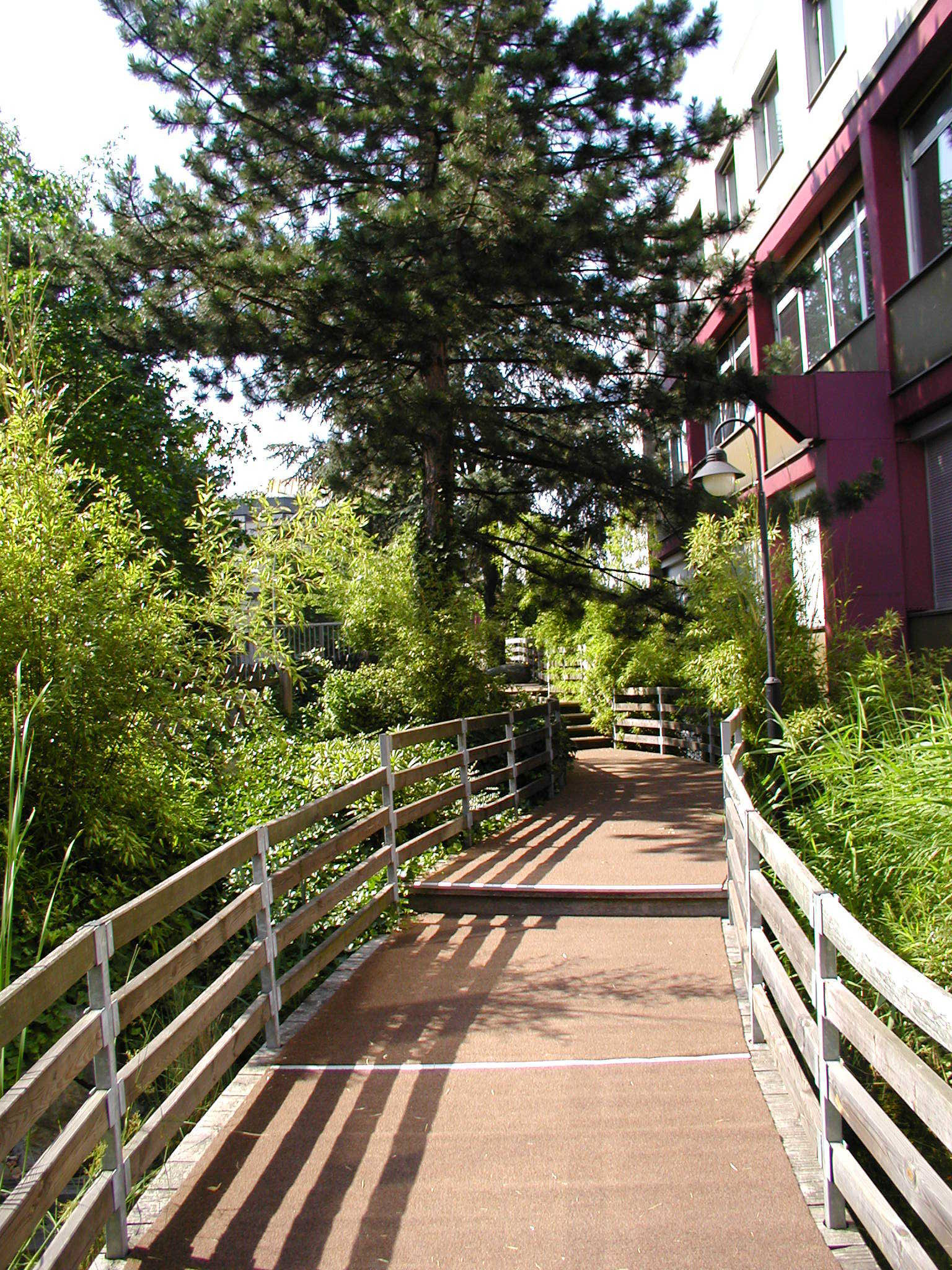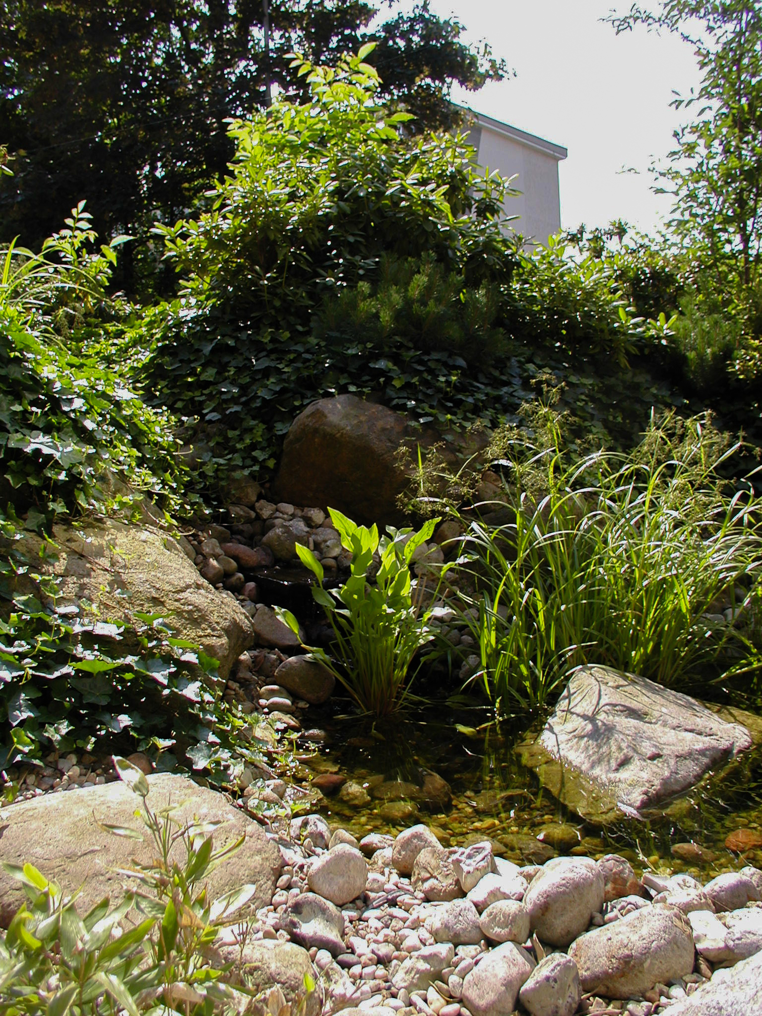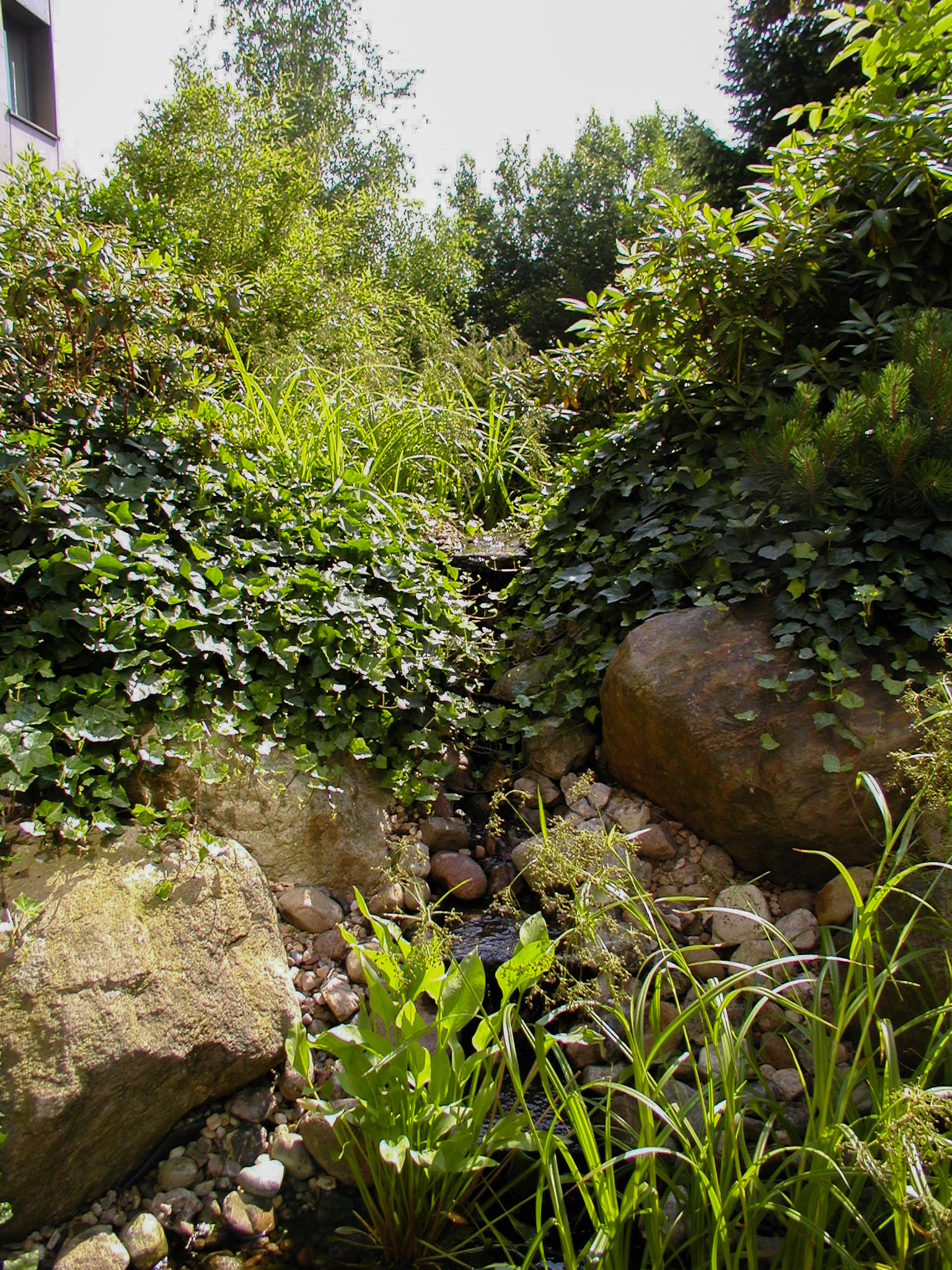 In Berlin-Lankwitz wurde entlang des Hauptzugangs zu einer Firmenzentrale ein mehrstufiger Bachlauf gestaltet, der Besucher einlädt und den Eingangsbereich auf besondere Weise inszeniert.