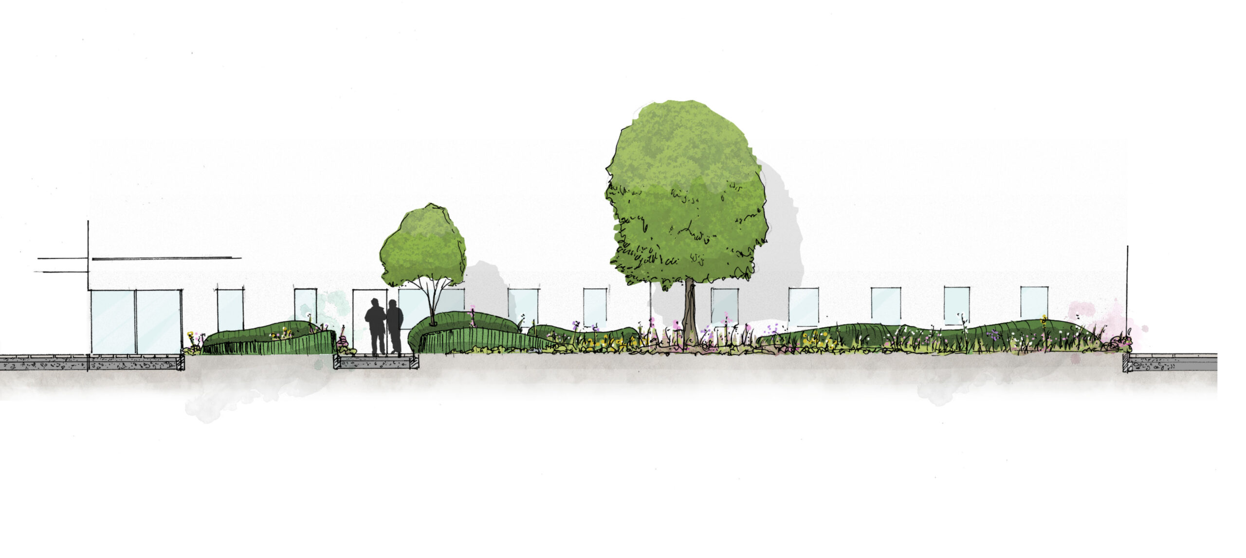 Stellplatz- und Funktionsflächen werden mit versickerungsfähigen Belägen ausgeführt und durch Hecken, Pergolen sowie Fassadenbegrünungen räumlich gefasst. Kletterpflanzen und rankende Gehölze übernehmen dabei sowohl gestalterische als auch klimatische Funktionen, reduzieren die Aufheizung von Oberflächen und schaffen wertvolle Lebensräume für Insekten und Vögel. In unmittelbarer Nähe der Gebäude sind die Pflanzungen dichter und formaler angelegt, während sie sich mit zunehmender Entfernung auflockern und in parkartige sowie wiesenähnliche Bereiche übergehen. Diese Abfolge erzeugt Orientierung, Ruhe und ein differenziertes Freiraumerlebnis.