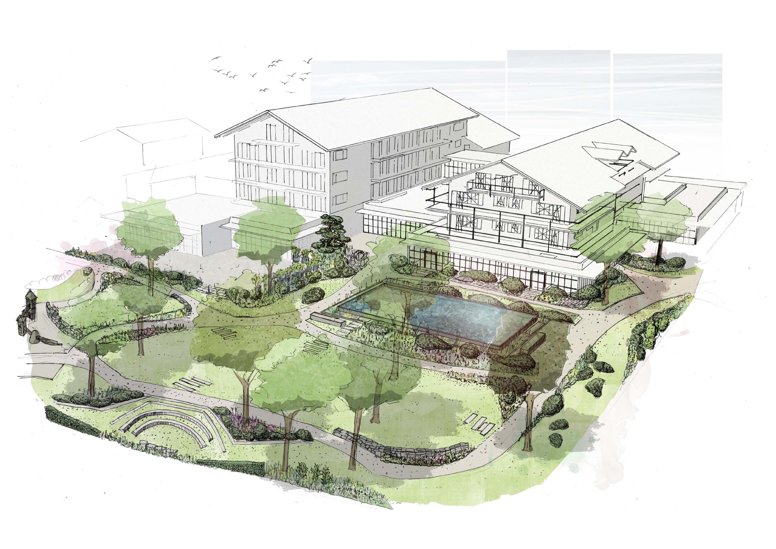 Die Hotelanlage ist in eine weitläufige Garten- und Parklandschaft eingebettet, in der Architektur, Topografie und Vegetation zu einem stimmigen Gesamtbild zusammengeführt werden. Ziel der Freiraumplanung ist es, funktionale Anforderungen, hochwertige Materialien und ökologische Wirksamkeit mit einer Atmosphäre von Ruhe, Offenheit und Erholung zu verbinden.