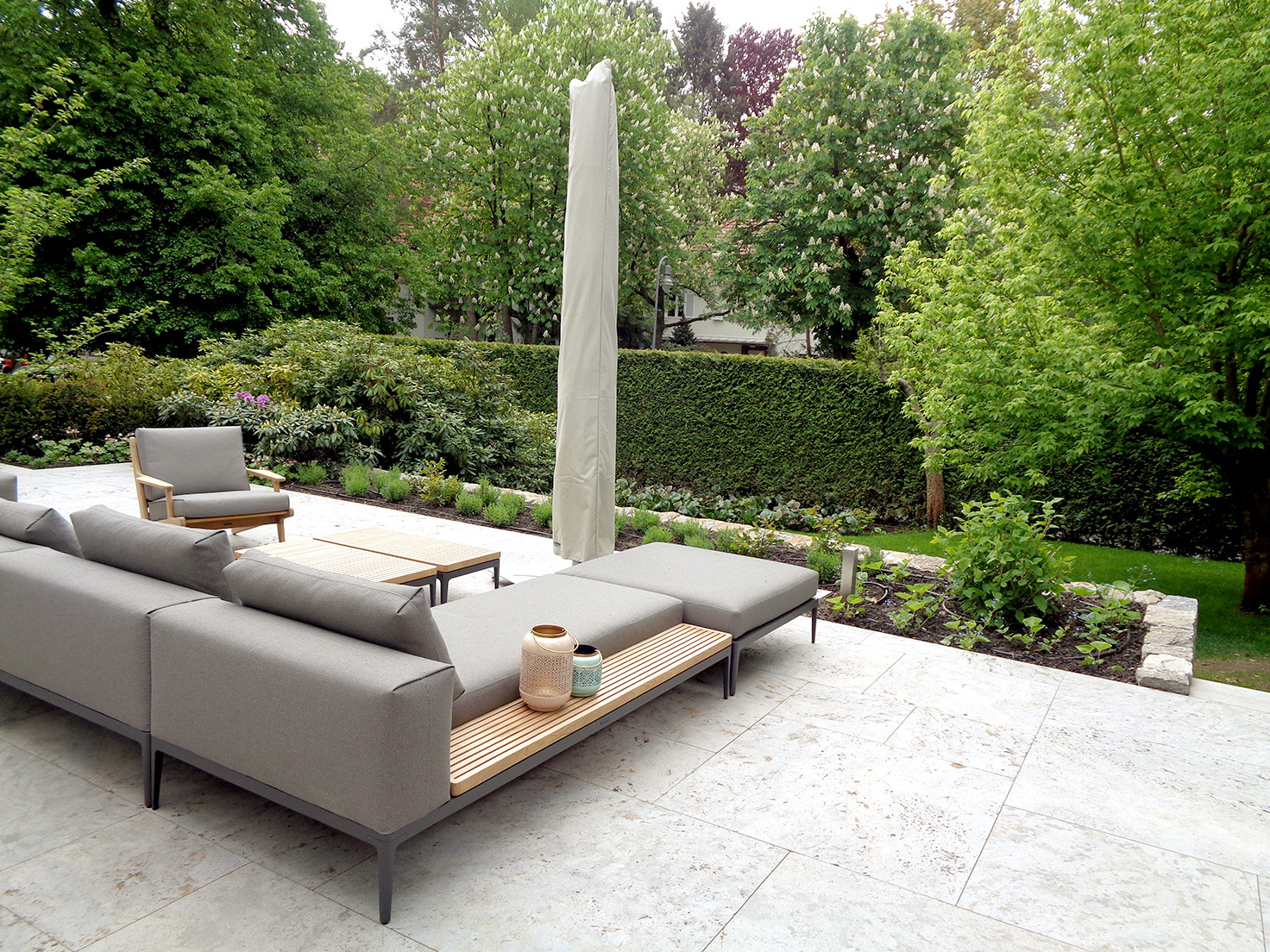 Die großzügige Hausterrasse ist mit anthrazitfarbenen, großformatigen Muschelkalkplatten im römischen Verband ausgelegt. Randlich fasst eine niedrige Buchshecke die Beete ein, während Stauden und Gräser über die Mauerkrone hinauswachsen und den Raum weich umspielen.