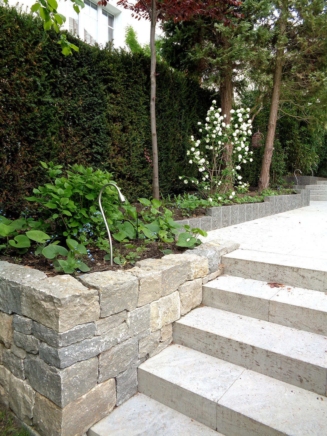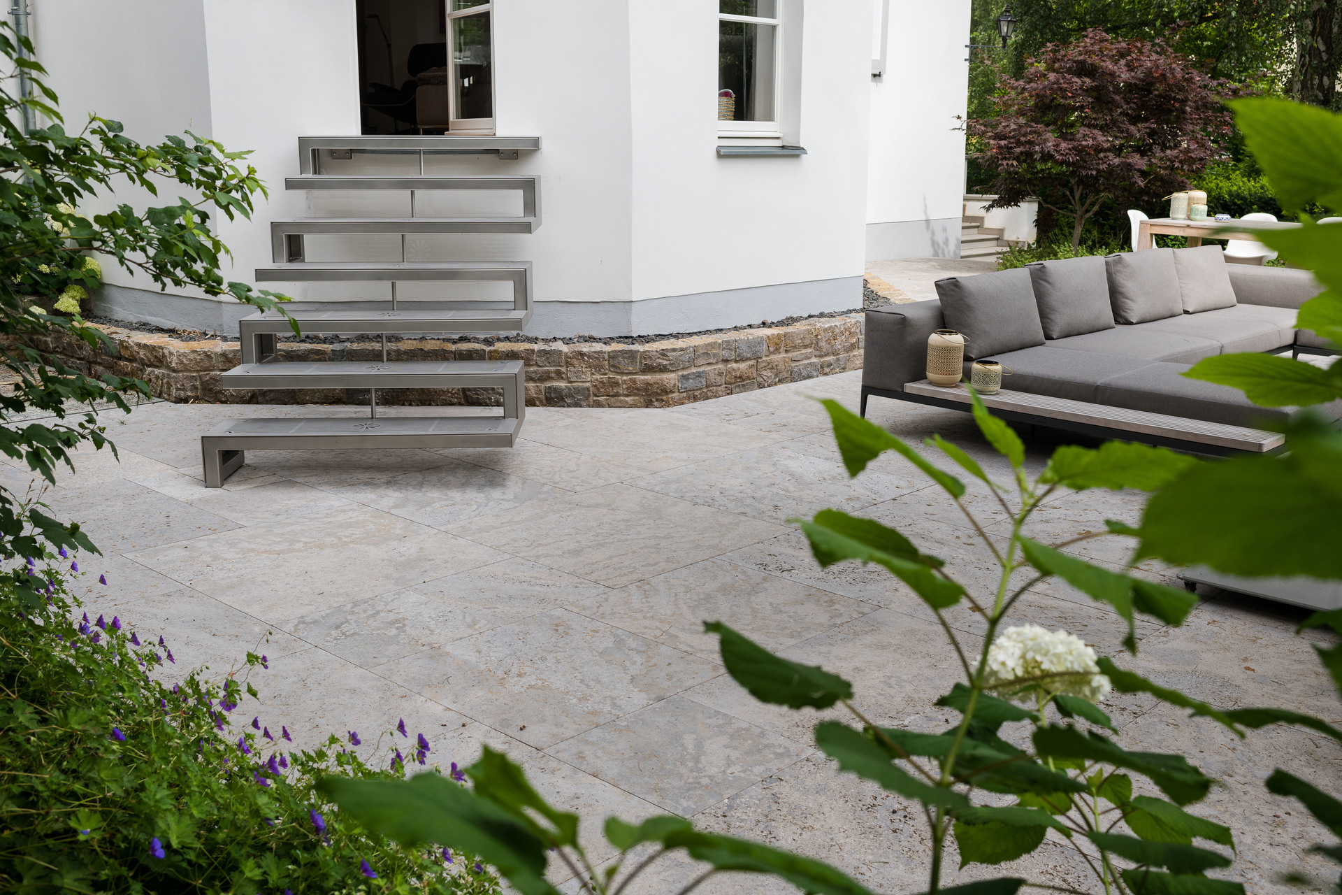 Eine Treppenanlage aus Muschelkalk-Blockstufen mit dazwischenliegenden Podesten führt behutsam hinauf zur Hausterrasse. Ein Mosaik aus gebrochenen Krustenplatten, eingefasst von rechteckigen Platten, markiert das Wegekreuz zwischen Terrasse und Haustür. Seitliche Pflanzbeete und ein Kalksteinmauerwerk fangen den Höhenversprung elegant ab. Mehrstämmige Schirmgehölze wie Blumenhartriegel und Kupferfelsenbirne spenden ein leichtes Blätterdach über der Treppe und schaffen eine harmonische Verbindung zwischen Architektur und Natur.