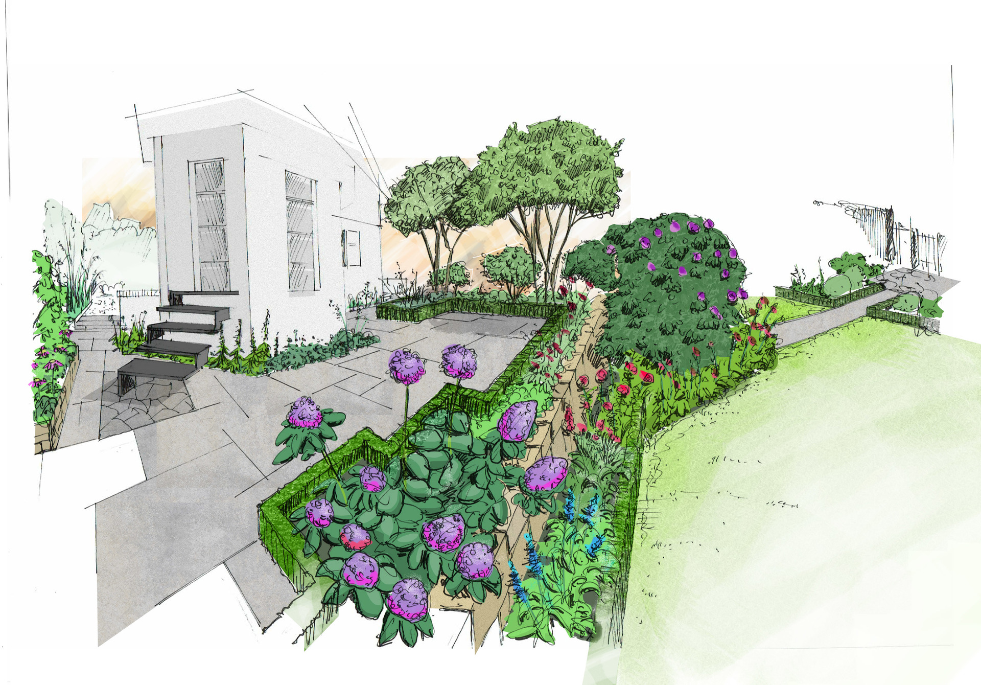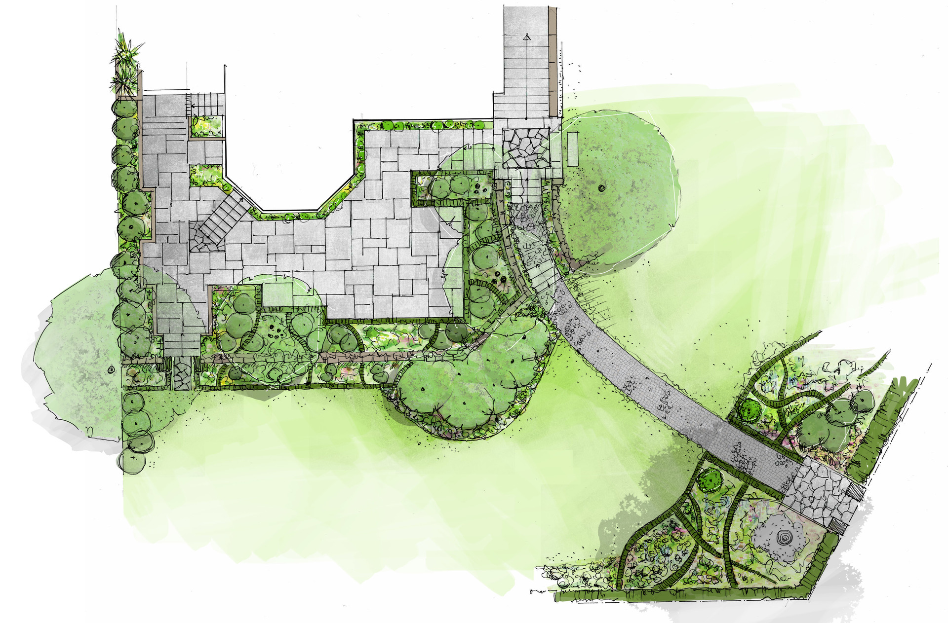Harmonische Wegeführung zwischen Haus und Garten