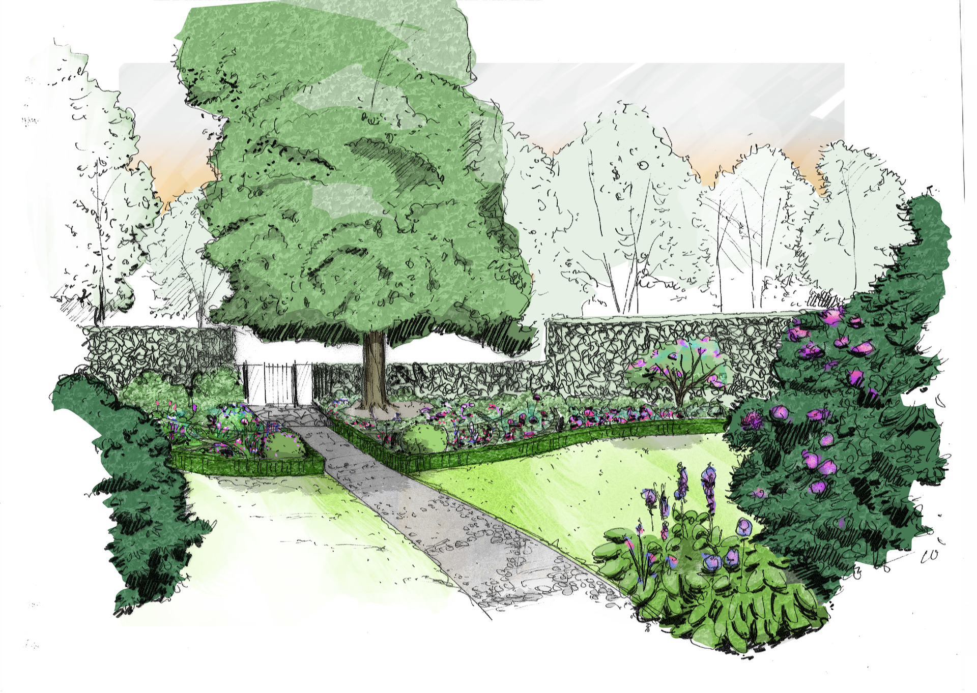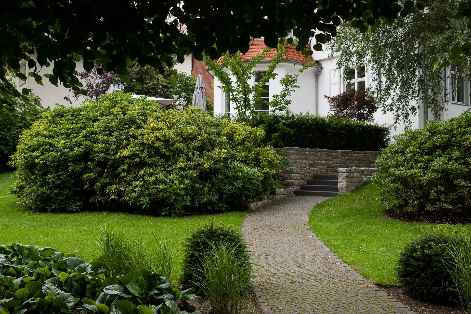 Der Weg aus Kleinsteinpflaster schlängelt sich in einem sanften Bogen an einer Rhododendrongruppe vorbei, die mit Funkien und dekorativen Gräsern unterpflanzt ist. Strukturreiche Knotenbeete säumen den Weg und verleihen dem Eingang lebendige Akzente.