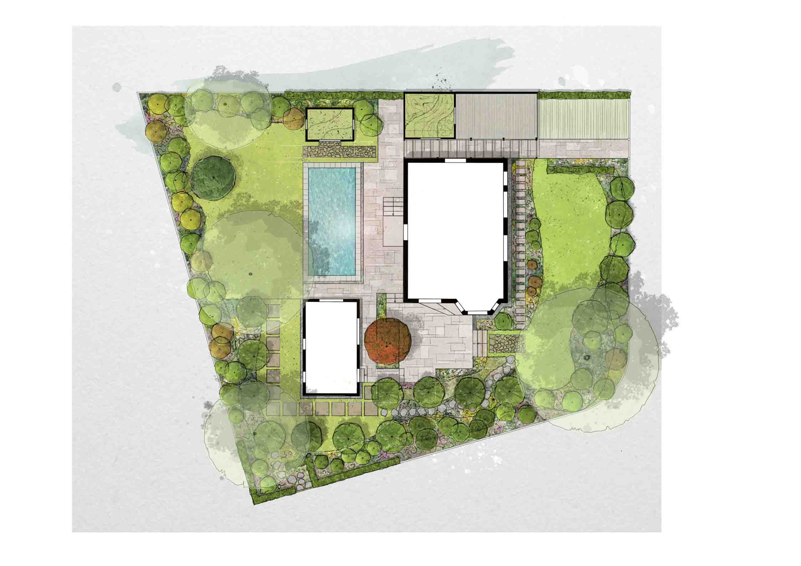 Im Zentrum der Gartengestaltung stehen der Pool und ein Tinyhouse, die gemeinsam das Herzstück des Gartens bilden. Sie fungieren als Ort der Erholung, des Rückzugs und der Begegnung – eingebettet in eine ruhige, grüne Gartenlandschaft. Wege- und Terrassenflächen wurden neu angelegt und gliedern den Garten in unterschiedliche Nutzungsbereiche. Die Rasenflächen sowie die Pflanzbereiche entlang der Grundstücksgrenzen im hinteren Garten wurden vollständig neu hergestellt und bilden einen weichen, natürlichen Rahmen.