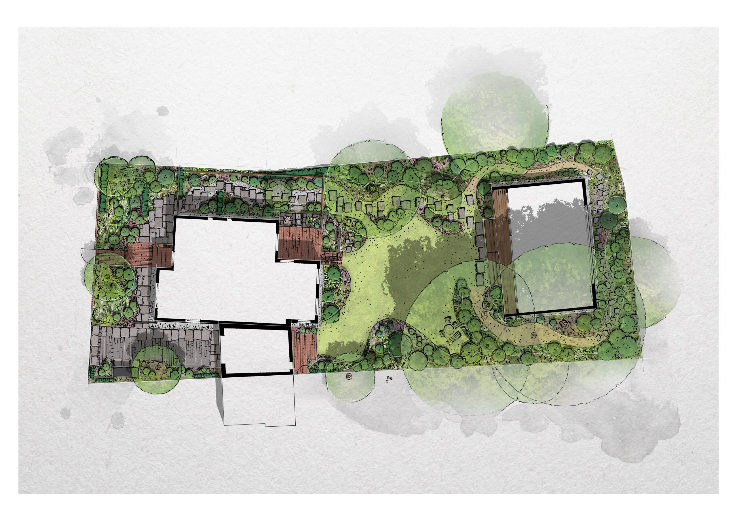 Nach der Realisierung eines modernen Holzhauses in modularer Bauweise wurde der Garten neu gestaltet und behutsam an die veränderten räumlichen und funktionalen Anforderungen angepasst. Ziel war es, einen Garten zu schaffen, der Alt und Neu miteinander verbindet und zugleich klare Funktionen sowie eine hohe Aufenthaltsqualität bietet. Im Zuge der Neugestaltung wurden die funktionalen Fußwege ebenso wie die PKW- und Garagenzufahrt wiederhergestellt und in das neue Gestaltungskonzept integriert.