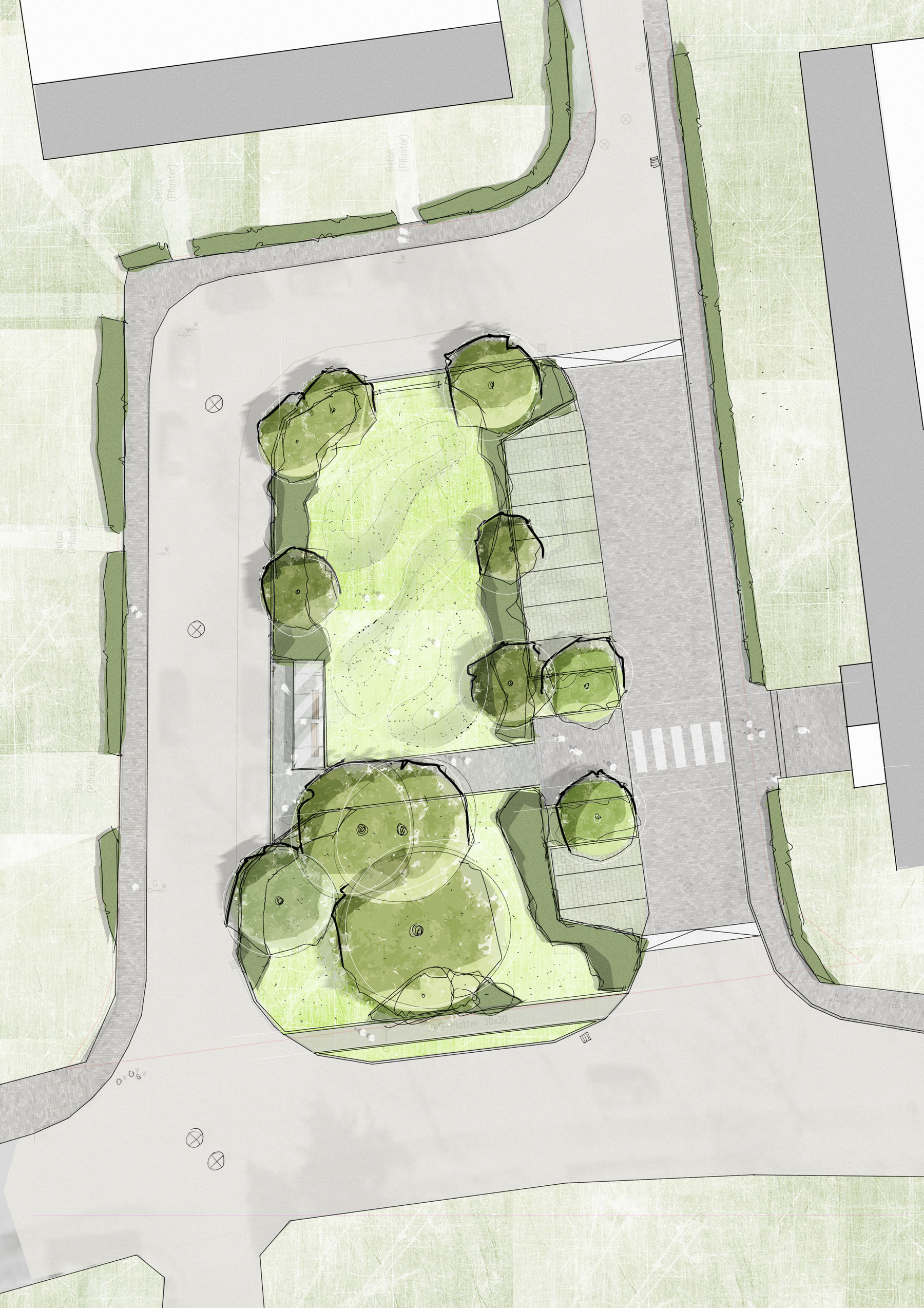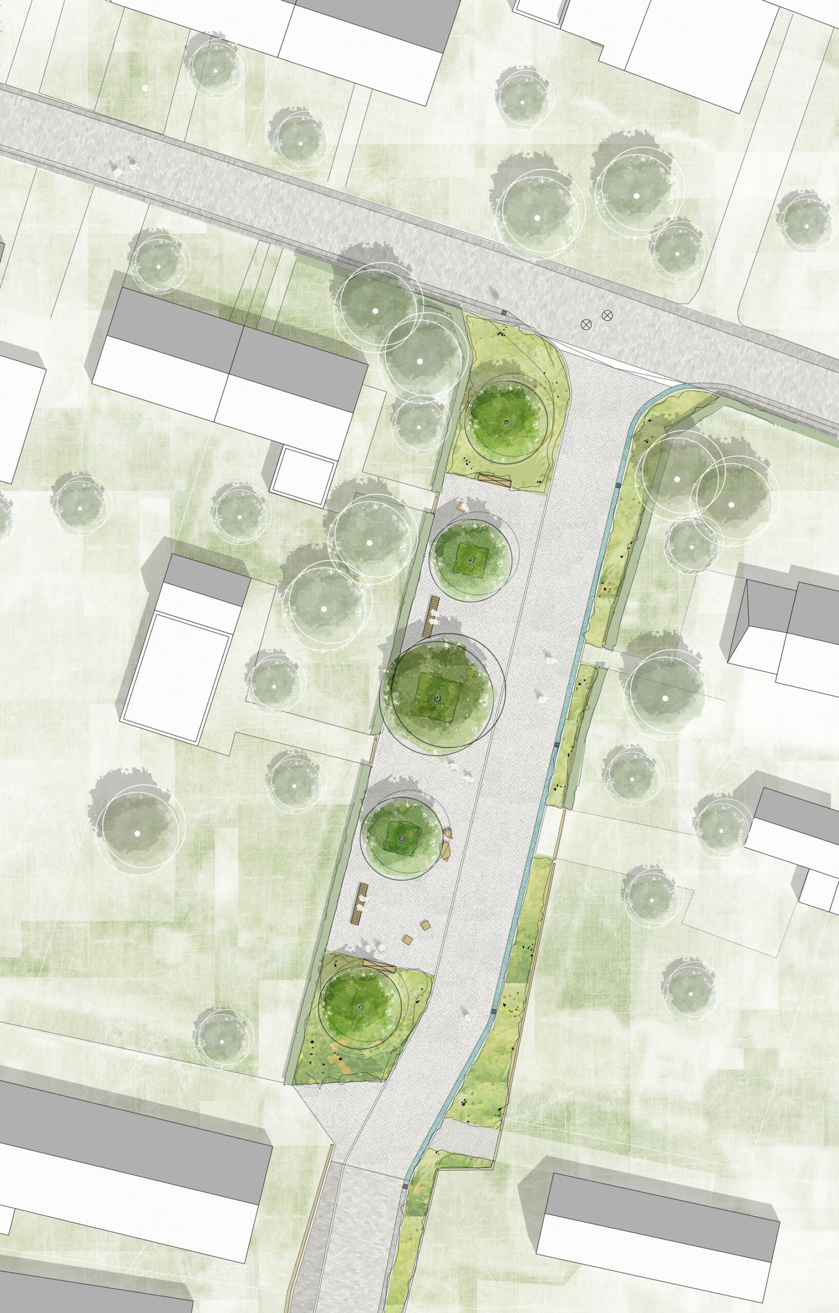 Der Entwurf sieht einen durchgehenden Pflasterteppich aus Kleinsteinpflaster Granit vor, der den gesamten Platz einfasst. Die Gestaltung ist bewusst steinern und urban, um einen klaren Kontrast zur umliegenden grünen Gartenlandschaft zu schaffen. Die Fahrbahn wird lediglich durch minimal abgesenkte Bordsteine sichtbar, sodass die Platzgestaltung ungestört wirkt. Eine Baumreihe und Sitzbänke markieren die Raumkante zu den angrenzenden Grundstücken. Der Verkehr wird nach Osten verlegt, sodass Einfahrten der Anwohner problemlos zugänglich bleiben, ohne dass Autos über die Platzfläche fahren.