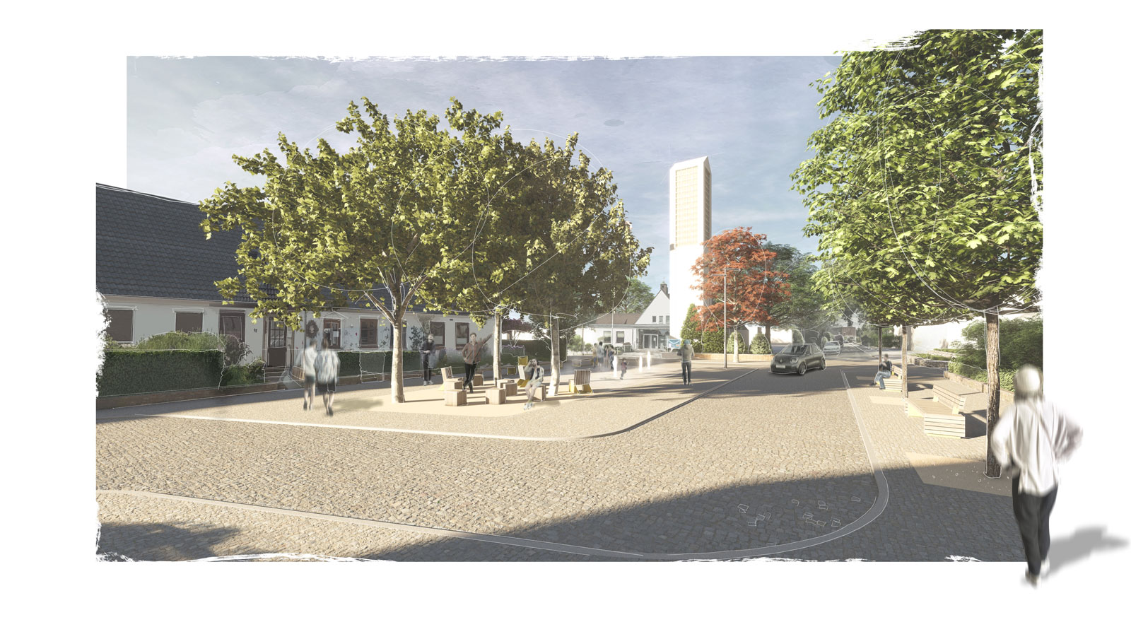 Der Entwurf sieht einen durchgehenden Pflasterteppich aus Kleinsteinpflaster Granit vor, der den gesamten Platz einfasst. Die Gestaltung ist bewusst steinern und urban, um einen klaren Kontrast zur umliegenden grünen Gartenlandschaft zu schaffen. Die Fahrbahn wird lediglich durch minimal abgesenkte Bordsteine sichtbar, sodass die Platzgestaltung ungestört wirkt. Eine Baumreihe und Sitzbänke markieren die Raumkante zu den angrenzenden Grundstücken. Der Verkehr wird nach Osten verlegt, sodass Einfahrten der Anwohner problemlos zugänglich bleiben, ohne dass Autos über die Platzfläche fahren.