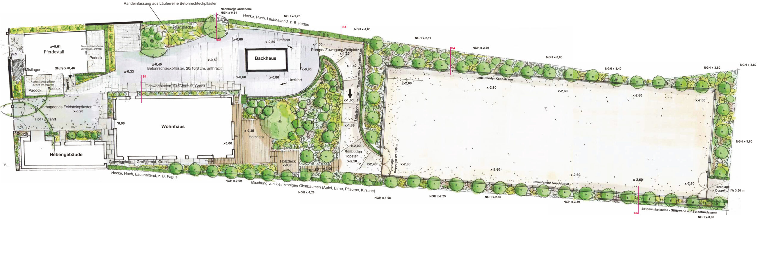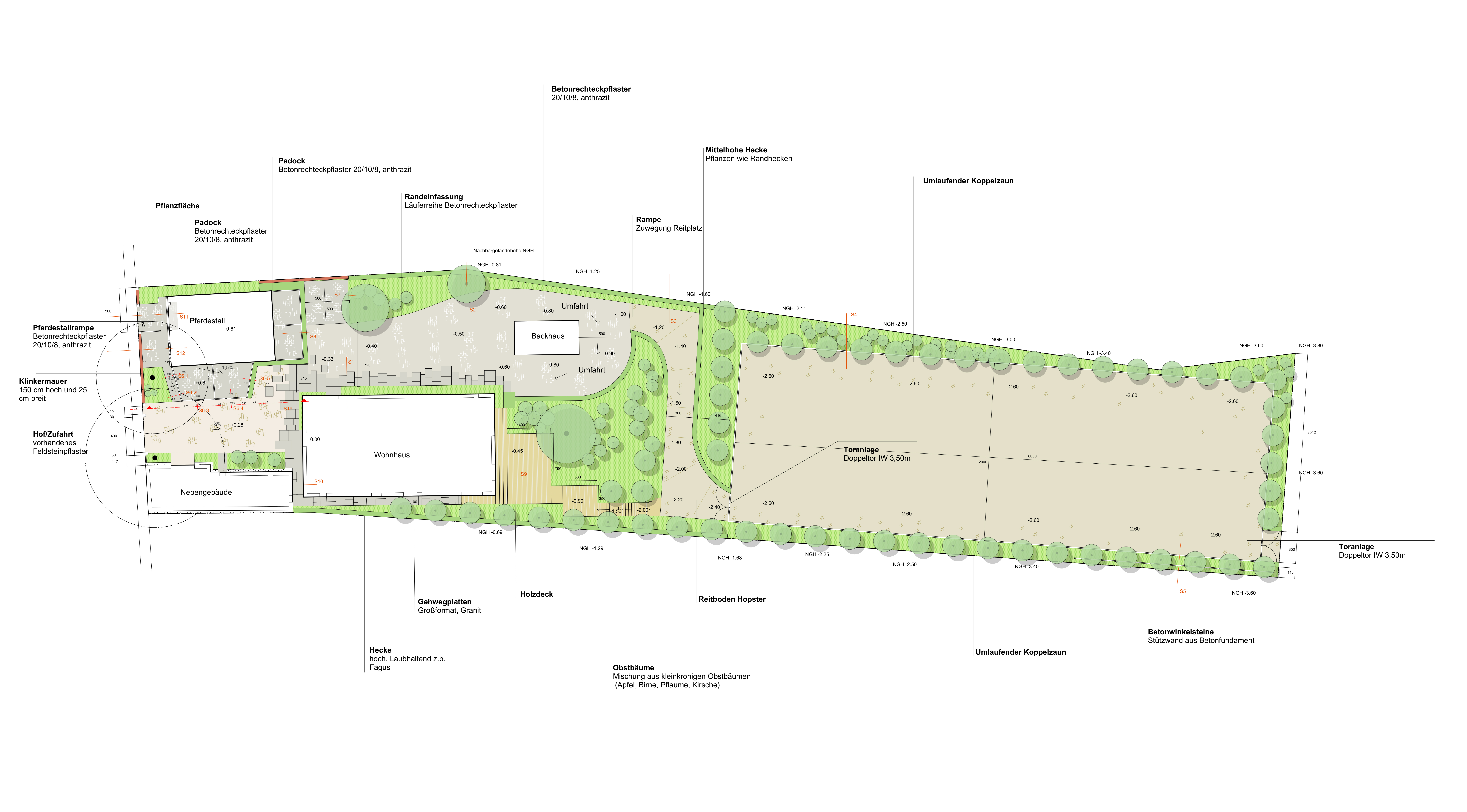 Neben weitläufigen Weideflächen, Reitwegen und Stallbereichen prägen künftig ein Pferdestall, ein Backhaus, ein Wohnhaus sowie ein Nebengebäude das Gelände. Die klare Wegeführung und die gezielte Anordnung der Gebäude schaffen Struktur, kurze Wege und harmonische Übergänge zwischen den einzelnen Funktionsbereichen.