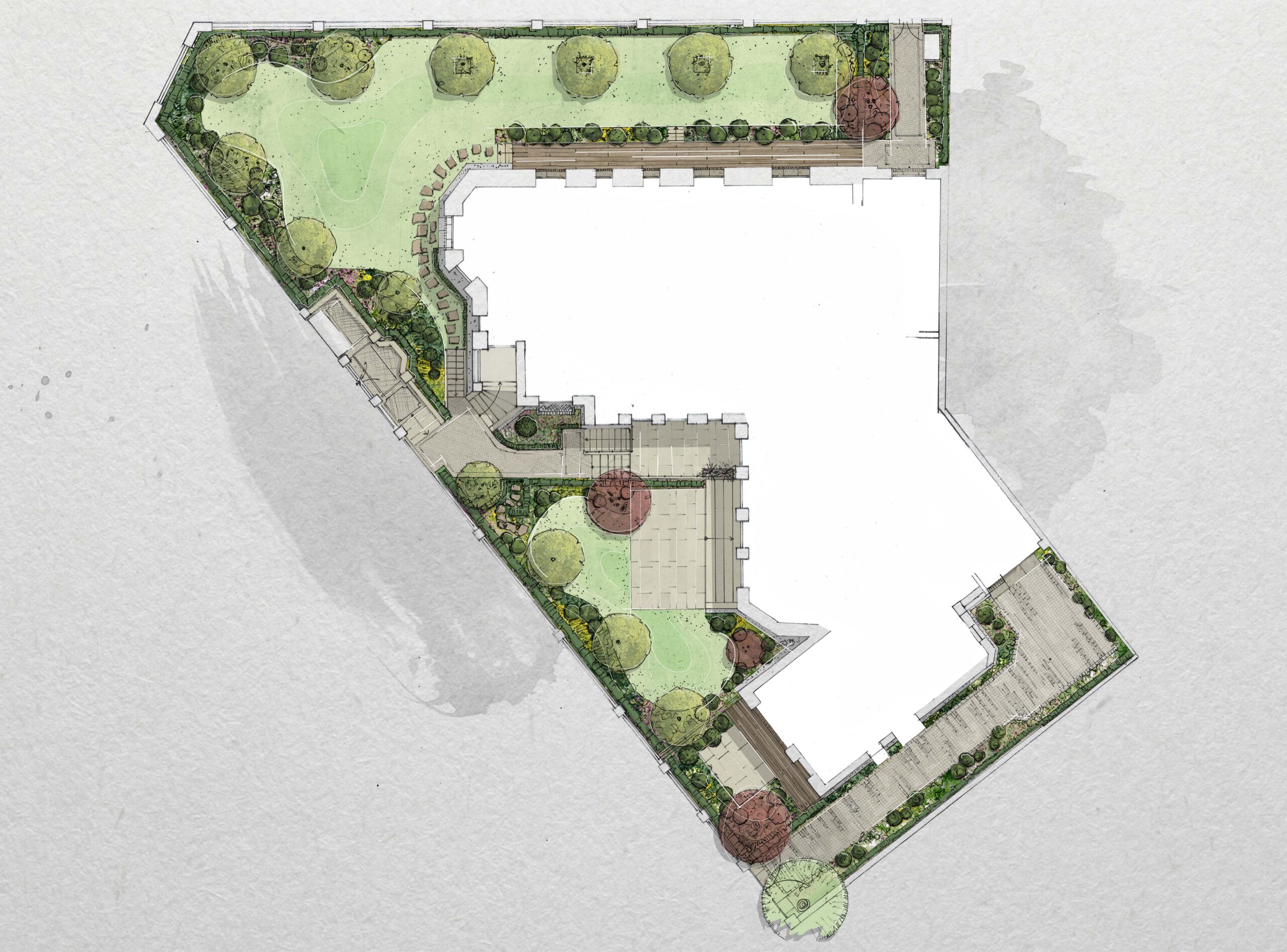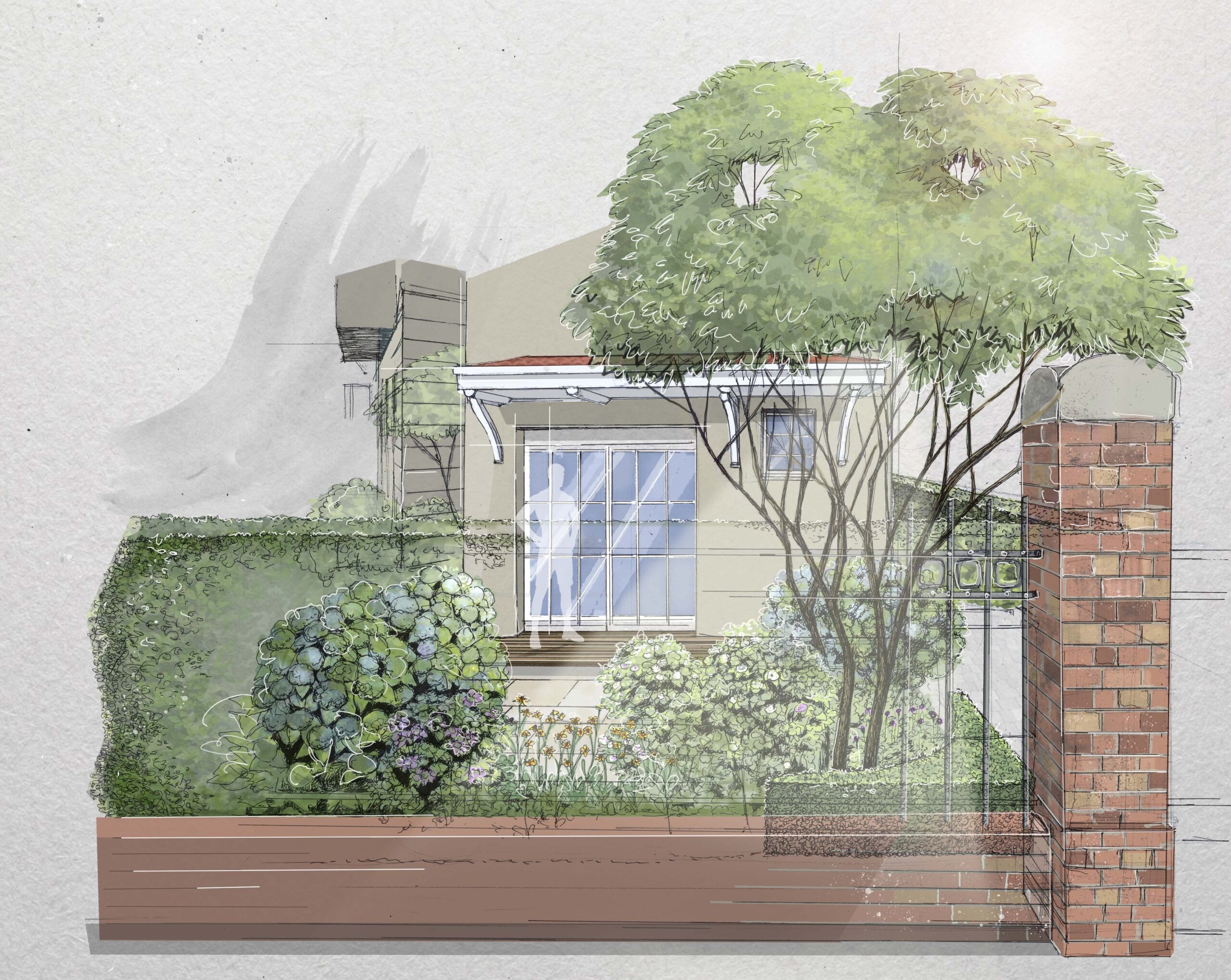 Der Südgarten bildet den Hauptgarten und wird als großzügiger, klar gefasster Gartenraum angelegt. Raumkanten aus dekorativen, kleinkronigen Laubbäumen strukturieren den Bereich und verleihen ihm Maßstab und Tiefe. Eine blickdichte Einfassungshecke aus Eibe sorgt für Privatsphäre und bildet zugleich einen ruhigen, immergrünen Hintergrund. Ausdrucksstarke, mehrstämmige Schirmgehölze setzen vertikale Akzente, während Gehölzgruppen sowie standortgerechte Stauden- und Gräserpflanzungen für Lebendigkeit und saisonale Vielfalt sorgen. Eine Holzterrasse dient als verbindendes Element zwischen Haus und Garten und bietet zugleich einen einladenden Aufenthaltsort.