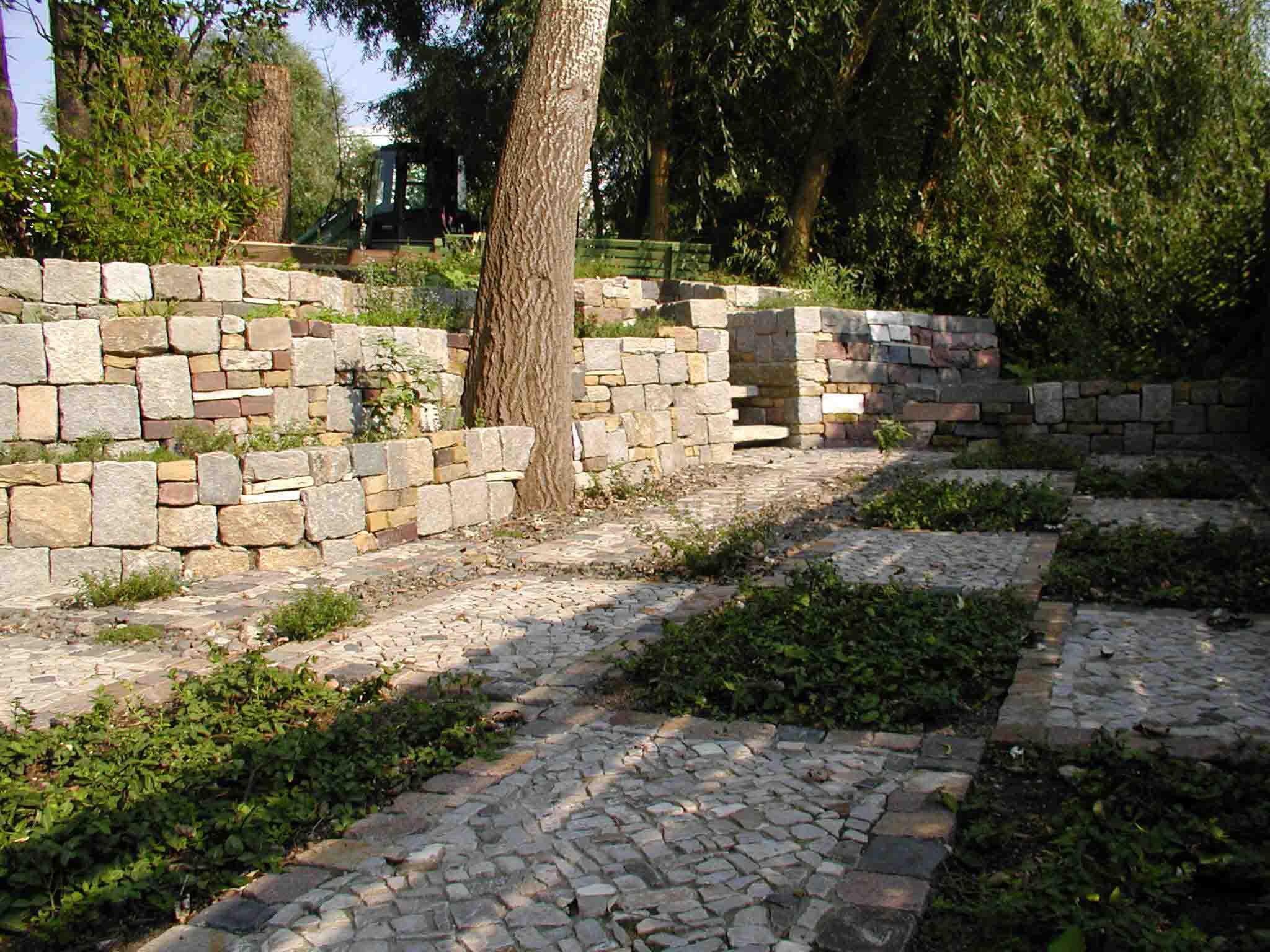 LAGADE realisierte für diesen Bereich terrassierte Stützmauern aus unterschiedlichen Natursteinen, die dem Gelände Struktur verleihen und zugleich harmonisch in die Umgebung eingebunden sind. Die bepflanzten Terrassen wurden mit kleinwüchsigen Gehölzen sowie standortgerechten Stauden und Gräsern gestaltet. Dadurch entsteht ein lebendiges, pflegeleichtes Pflanzbild, das den Charakter des Senkgartens unterstreicht.