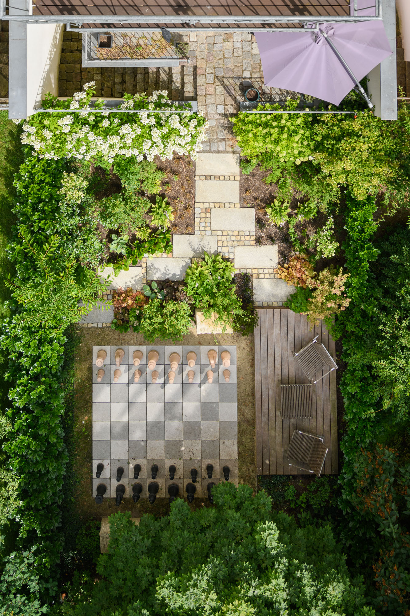 Ein besonderes Highlight bildet ein über Natursteintrittplatten erreichbares Gartenschachspiel, das sowohl zum Denksport als auch zum Verweilen einlädt. Die Spieler:innen agieren von großformatigen, optisch wie haptisch ansprechenden Sitzblöcken aus, während von der Holzterrasse aus das Spiel oder die Gesamtanlage genossen werden kann.
